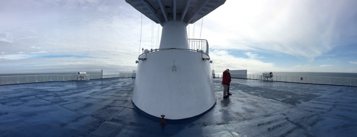 Martinas Gleichgewichtssinn hält sich dank ruhiger See und ein bisschen Ingwer sehr tapfer. Außerdem verursachen Wahlfontänen Glücksgefühle und tragen zur Ablenkung bei. Nach einem ausgiebigen Frühstück = Mittagessen, hat Martin schon eine Liste für den nächsten Defender-Umbau angelegt.