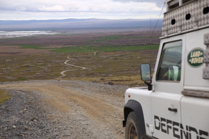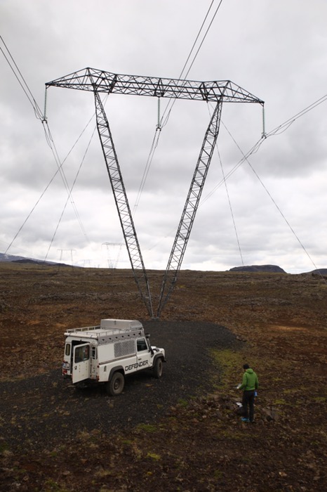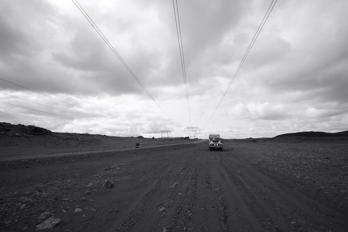 Parallel zu riesigen Strommasten führt die Piste F338 ziemlich holprig und sehr sandig von Westen nach Osten am Gletscher vorbei.