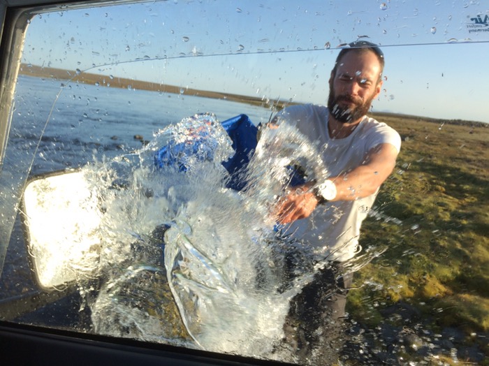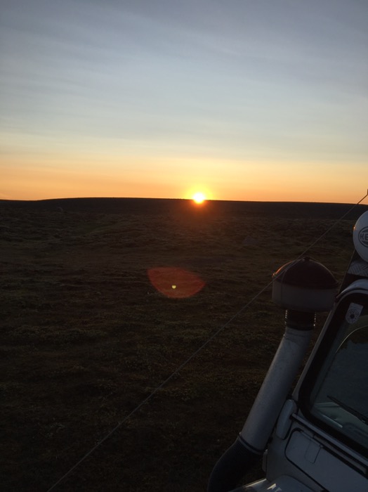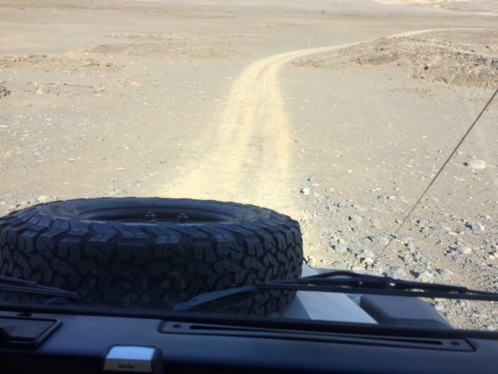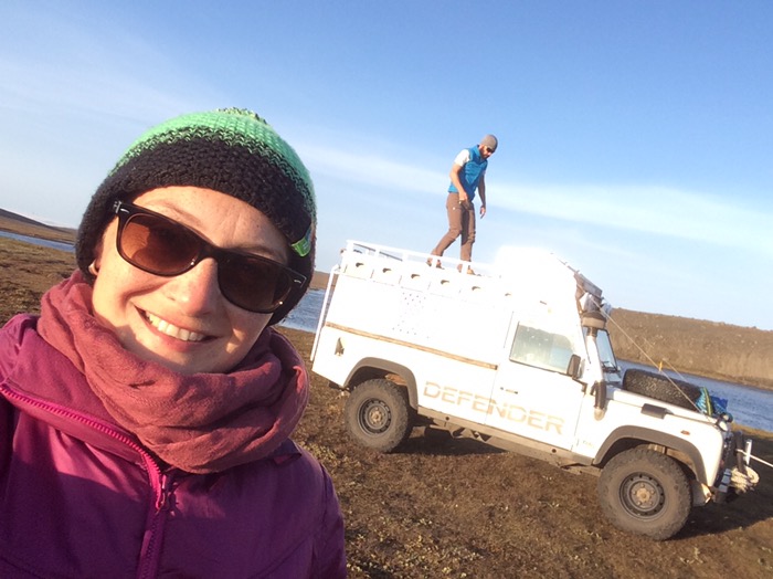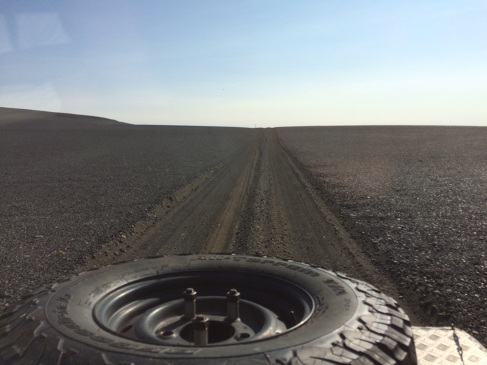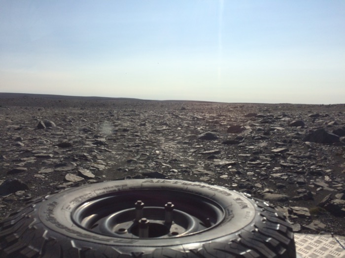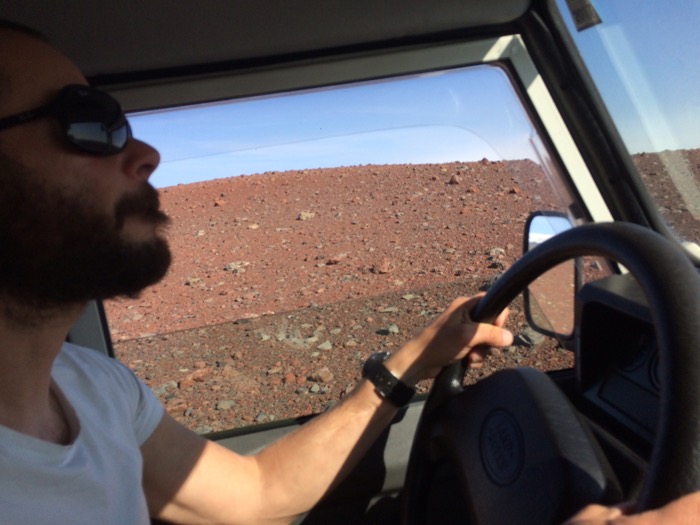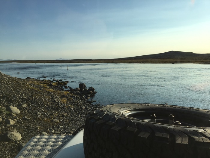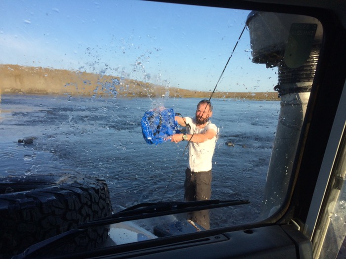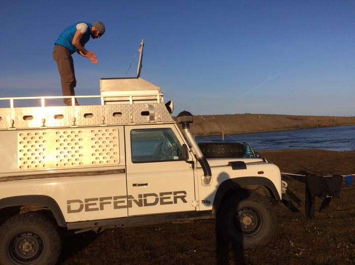 Am Ende von viel grauem, rotem und schwarzem Nix, halten wir am anderen Ende einer breiteren Furt an und schlagen unseren Schlafplatz direkt am Wasser auf. Martin betreibt Fellpflege am Defender und unfreiwillig an sich 😉