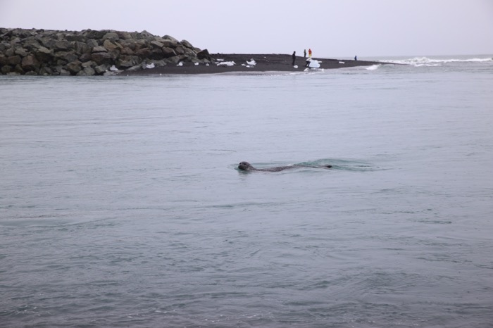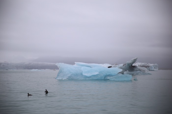 Hier konnten wir die ersten kleinen Eisstücke vom kalbenden Gletscher zusammen mit Enten und ein paar Robben schwimmen sehen.