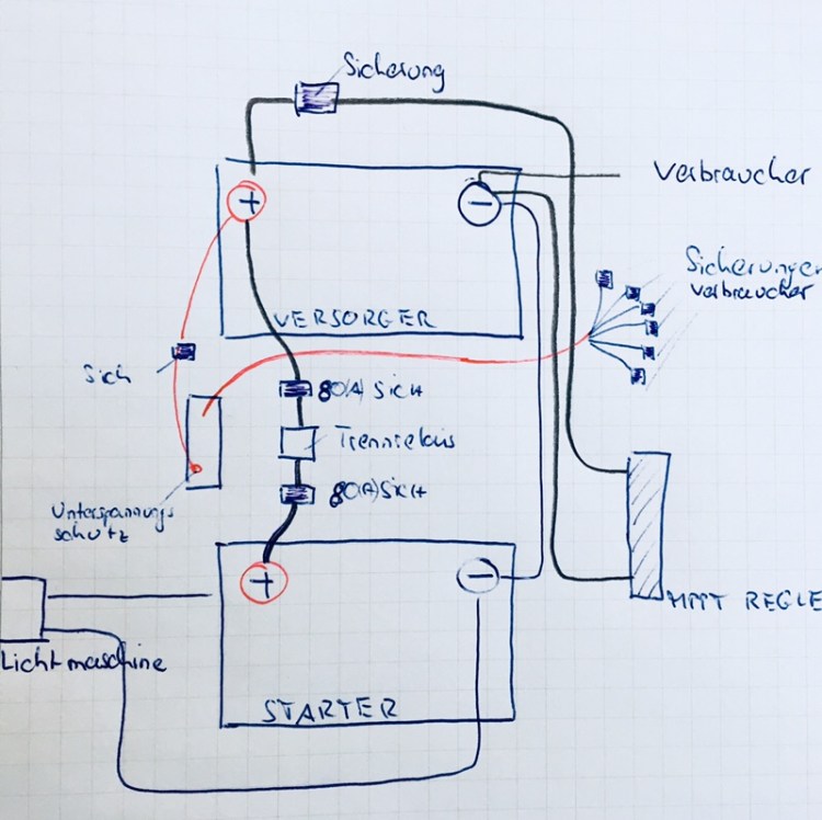 Als Versorger-Batterie kommt nun eine AGM Batterie hinein und die Verbraucher werden über einen Unterspannungsschutz damit verbunden.