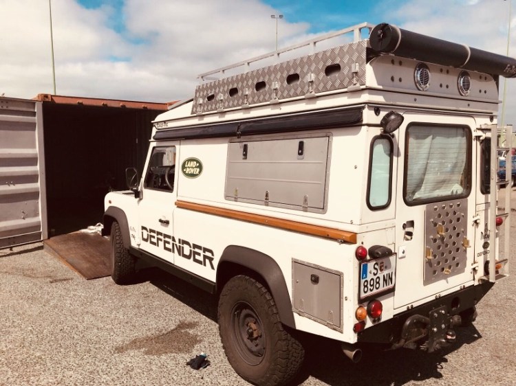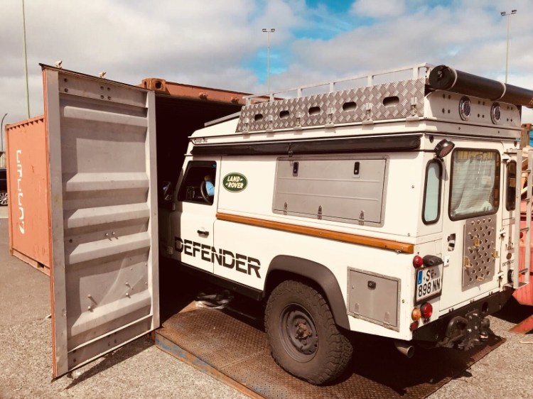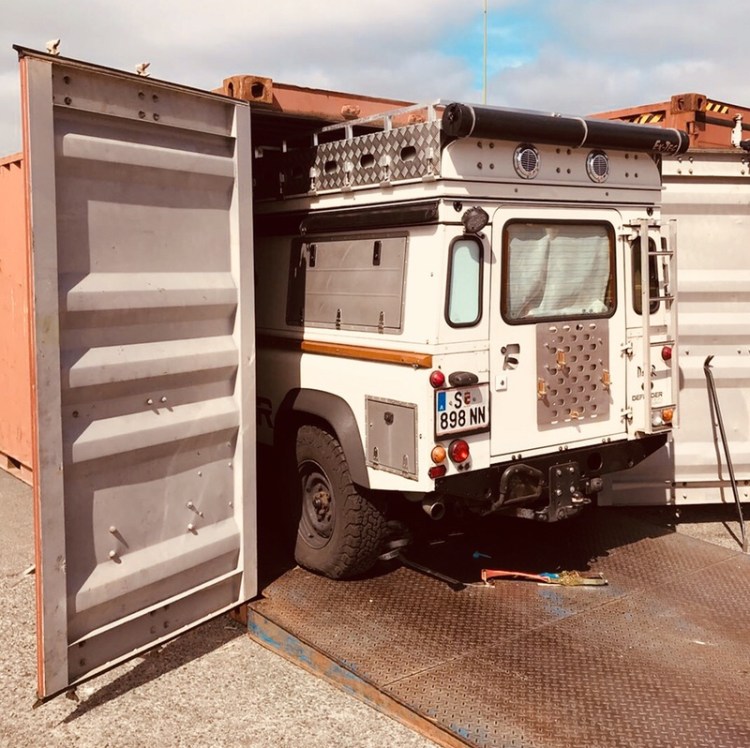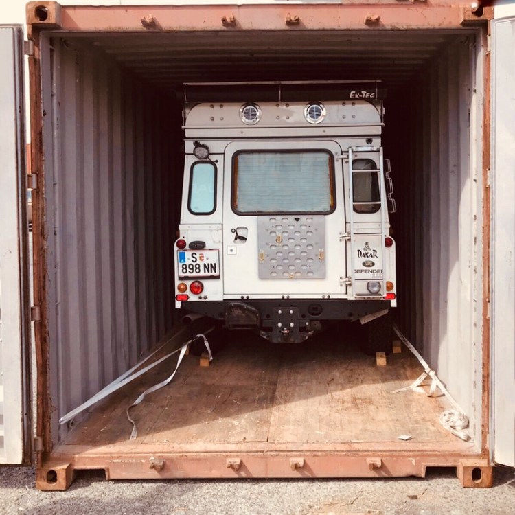 Ein kompetenter Partner (danke für den leckeren Café übrigens vor Ort) hat dann unseren Defender im Container verzurrt.