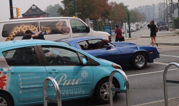 Beim Warten auf DIE Email vom Zoll wurden wir noch Zeuge einer witzigen Situation: Vor einer Ampel kam ein mit rausguggenden Tieren beklebter Van neben einem Auto zum Stehen, aus dem ein Hund schaute. Ich springe sofort auf und hol meine Kamera aus dem Rucksack… weil witziges Fotomotiv natürlich! – was sich der Hundebesitzer auch dachte und schnell ums Auto lief, seine Kamera ausm Kofferrraum holte und auch abdrückte, bevor es grün wurde. Irgendwie waren wir beide ein wenig im Stress, um den Schnappschuss zu bekommen.