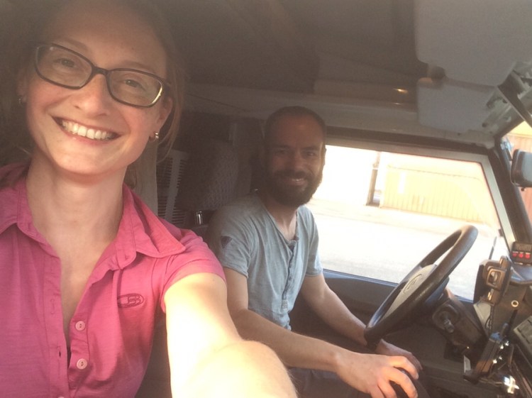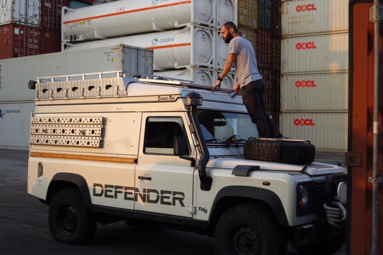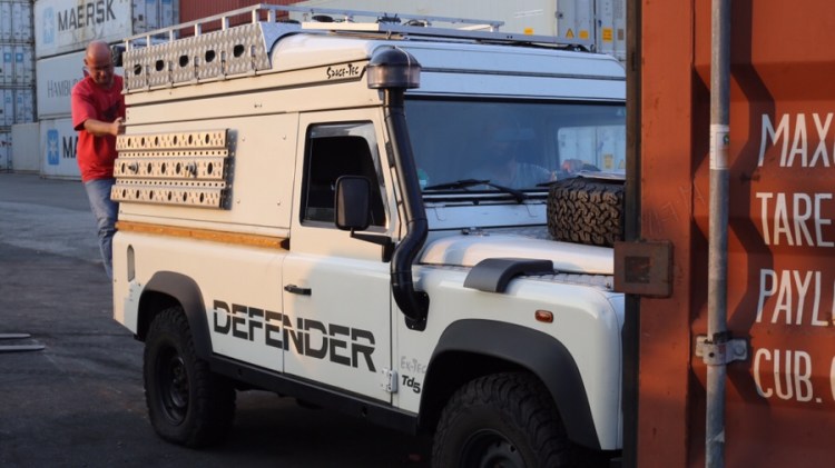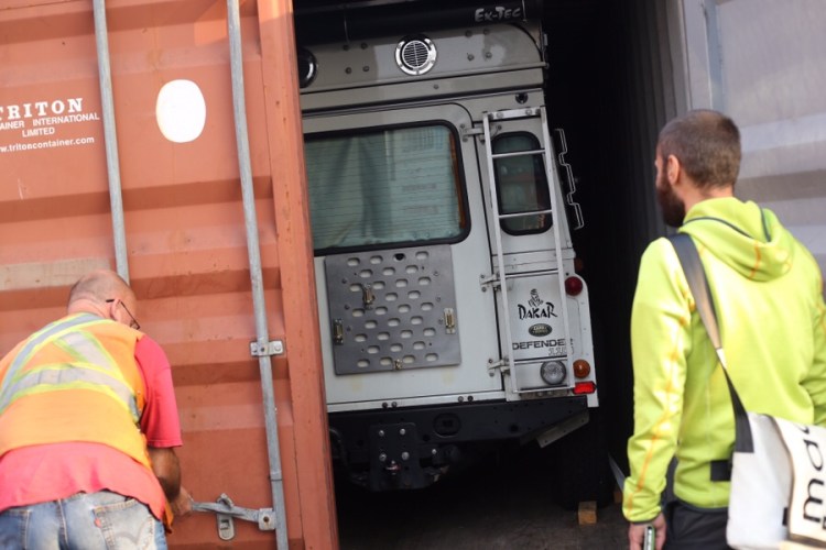 Die platten Reifen verwirrten Dave erstmal etwas, aber am Auto war alles gut! (Wir mussten in Bremerhaven das Auto ja ein bisschen absenken, damit der Landy in den Container passte) Etwas Gewicht hinten rechts noch und Rausfahren war kein Problem!