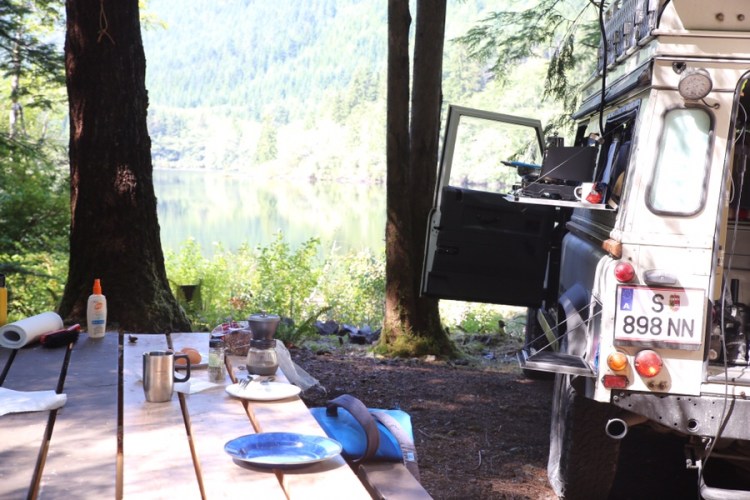 Es ist unglaublich, wie viele Kanadier, alle bewaffnet mit riiieeesengroßen Ford / GMC / Dodge auf uns zukommen und unser tiny Car bewundern! Ein paar Ausdrücke gefällig? – amazing – I’ve never seen something like that – nice setting – what is that? – I love your wheels – you have a cool car! Gestern haben wir wieder einen neuen Ausdruck für unseren Landy bekommen. „It looks like a Space Shuttle“