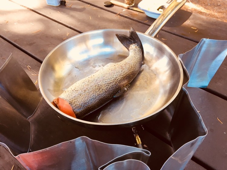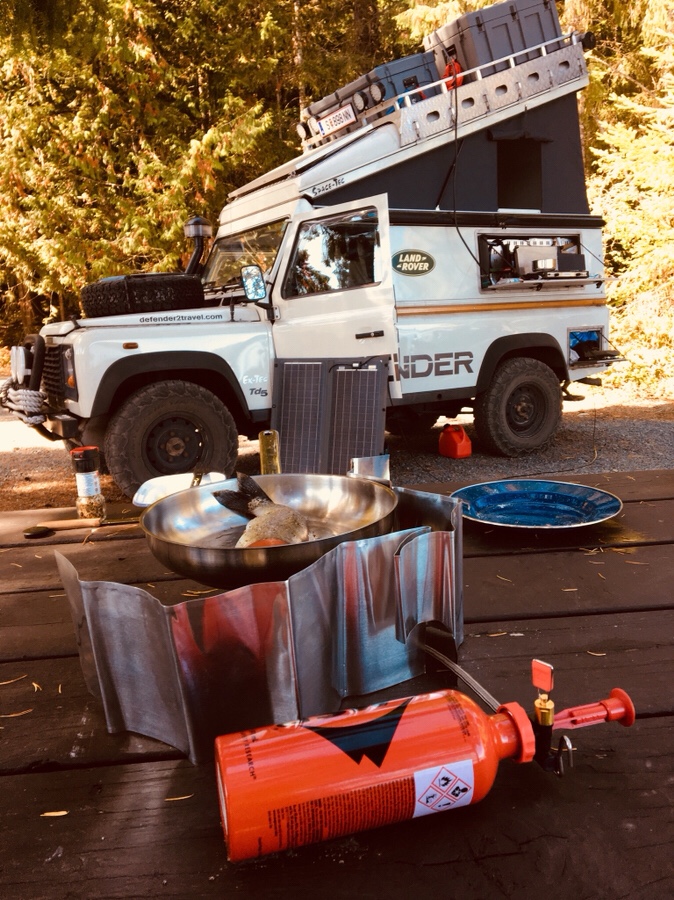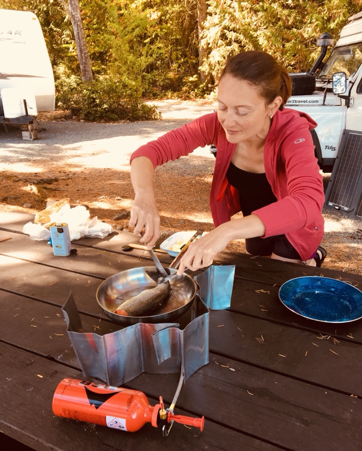 Unser Propangaskocher erweist uns gute Dienste, da in ganz British Columbia ein „Fire ban“ ausgesprochen ist und wir somit in den angebotenen Feuerstellen kein Lagerfeuer machen dürfen. Schade für unseren Grill auf dem Ersatz-Reifen, wobei seine Zeit sicher noch kommen wird. Und das nächste Mal, wenn uns ein lieber kanadischer Nachbar einen Fisch schenkt, können wir ihn hoffentlich aufs Feuer geben. (Thank you for the delicious fish!)