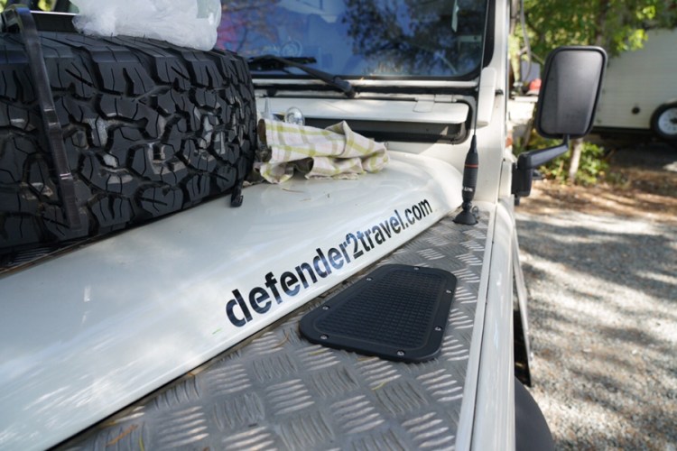 Gestärkt von dem leckeren Fisch – der aufmerksame Leser weiß Bescheid – messen wir zuerst die Positionen aus und bringen dann in sorgsamer Kleinarbeit “einen Buchstaben nach dem anderen” am Defender an. Langsam entsteht das neue Bild, wir sind beide begeistert – endlich! Zwar fahren wir ab nun nicht mehr komplett anonym herum, allerdings fallen wir hier mit unserem kleinen Defender sowieso immer unter den big trucks auf.