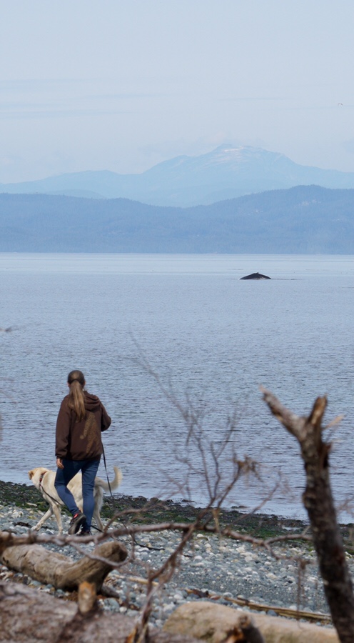 Ehrlich, wir hatten es gehofft, aber dass am ersten Morgen gleich einer zu sehen ist, voll schön! Es ist ein Humpback Wale, ein Buckelwal, mal näher und mal weiter weg schwimmt er vor unserer Nase hin und her. Zum ersten Mal im Leben einen Wal sehen! Etwas weit weg zum fotografieren, aber super mit Fernglas zu beobachten.