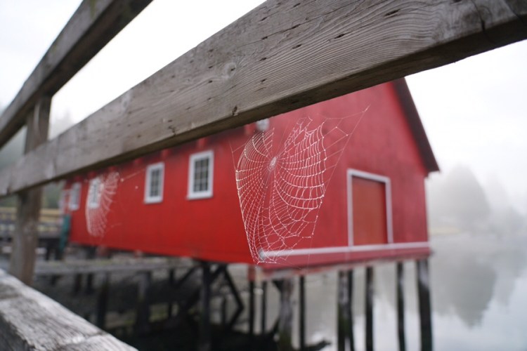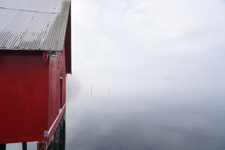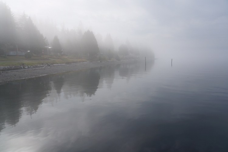 Alles ist ganz ruhig, nur das Meer und Nebel, kein Tier in Sicht, weiter weg hört man Motorsägengeräusche.