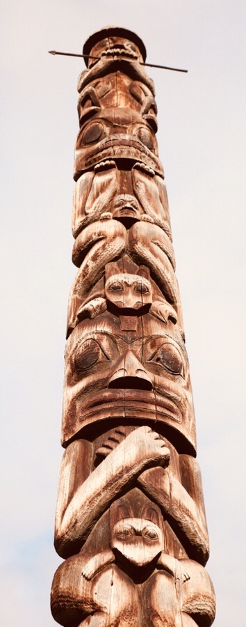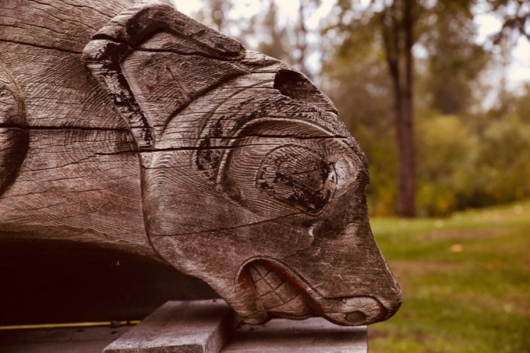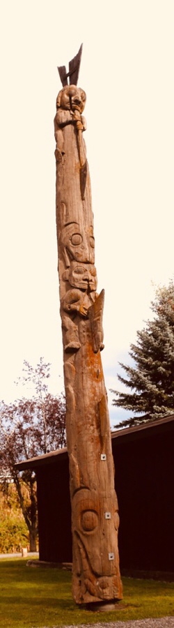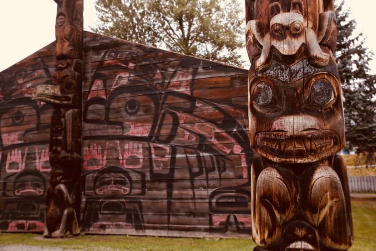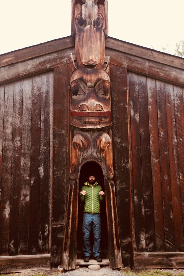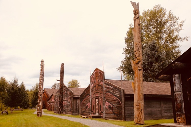 – Das Museum und die merkwürdigen Totems in Ksan. (Die liest man übrigens von unten nach oben und der mit dem gespaltenen Menschen, aus dem der Fisch kommt, hat uns noch beschäftigt.)