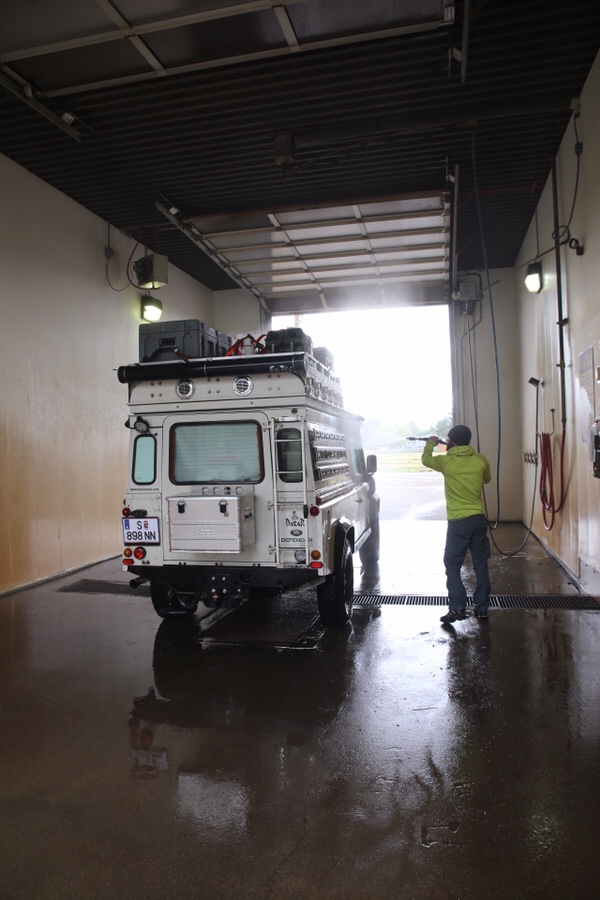 – Die Waschprozedeur ist diesmal in einer großen Anlage, in der der Defender richtig viel Platz hat.