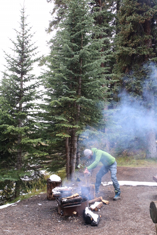 Für das Lagerfeuerpermit zahlen wir deshalb doch mal die 8 $ und merken, wie schwierig das Anzünden mit nassem Holz ist. Der Nachbar leiht sich gleich unsere kleine Axt aus, bevor Martin selbst zum Zug kommt. (merci dem lieben Maxi noch fürs Schleifen!)