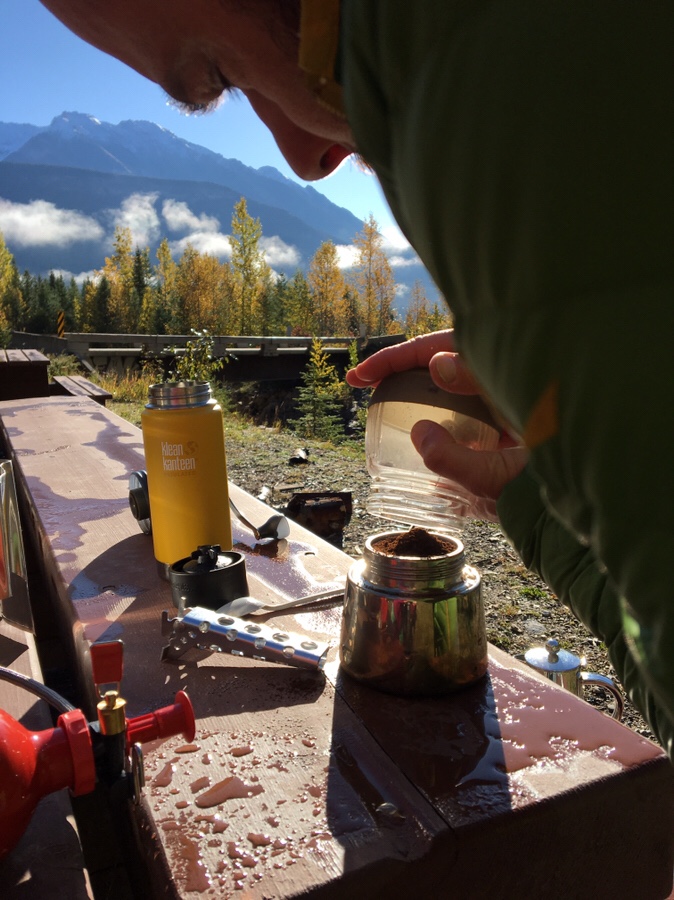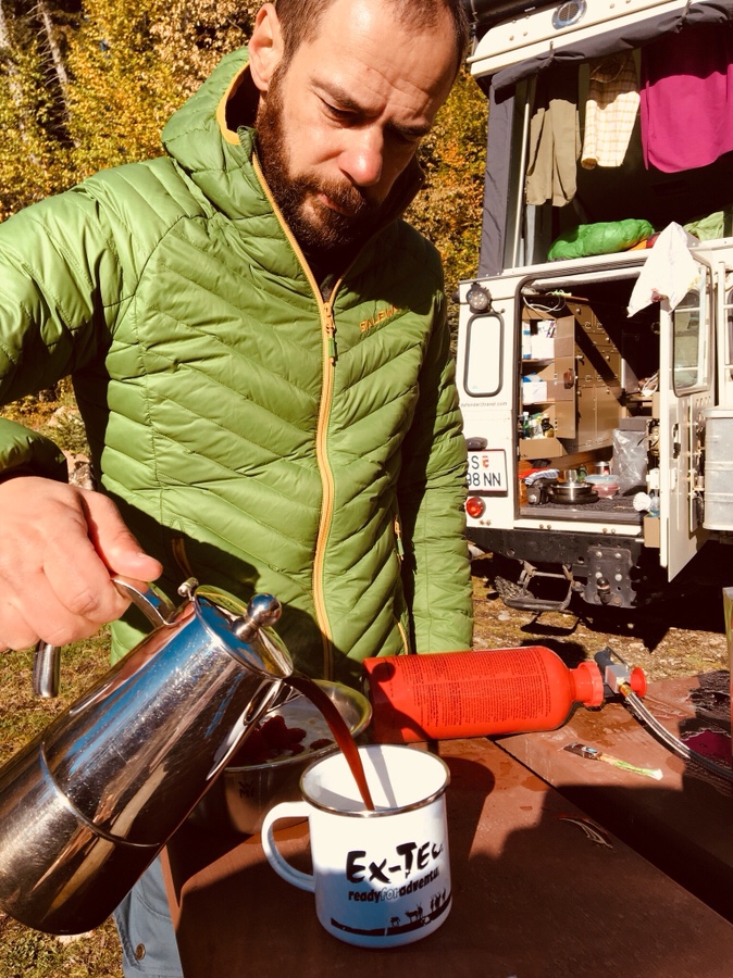 Da es so kalt ist, kochen wir meist nur schnell mit dem Benzinkocher was einfaches (was wohl? – Nudeln) und Baden geht auch echt sehr schnell, wenn der Bach direkt von einem Gletscher kommt… brrrr!!!