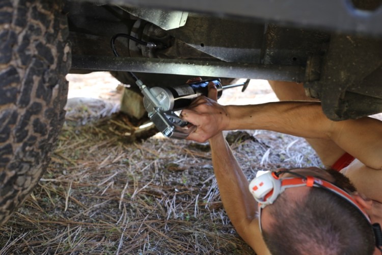 Zeit zum Warten des Defenders ist auch und ich möchte die Kreuzgelenke abschmieren. Fettpresse und Fett habe ich natürlich mit. Vor lauter Ungeschick fällt mir das ganze Fett aus der Presse und auf den Waldboden. Aaaaahhhhh!! – ich schleudere die Presse hinterher um meinen Unmut loszuwerden. Blöde Idee! Denn jetzt ist auch noch die Fettpresse voller „Wald“. Gefühlte einige Stunden später habe ich sie gereinigt und in 10 Minuten ist alles abgeschmiert. – Konnte das nicht gleich so gehen 😉