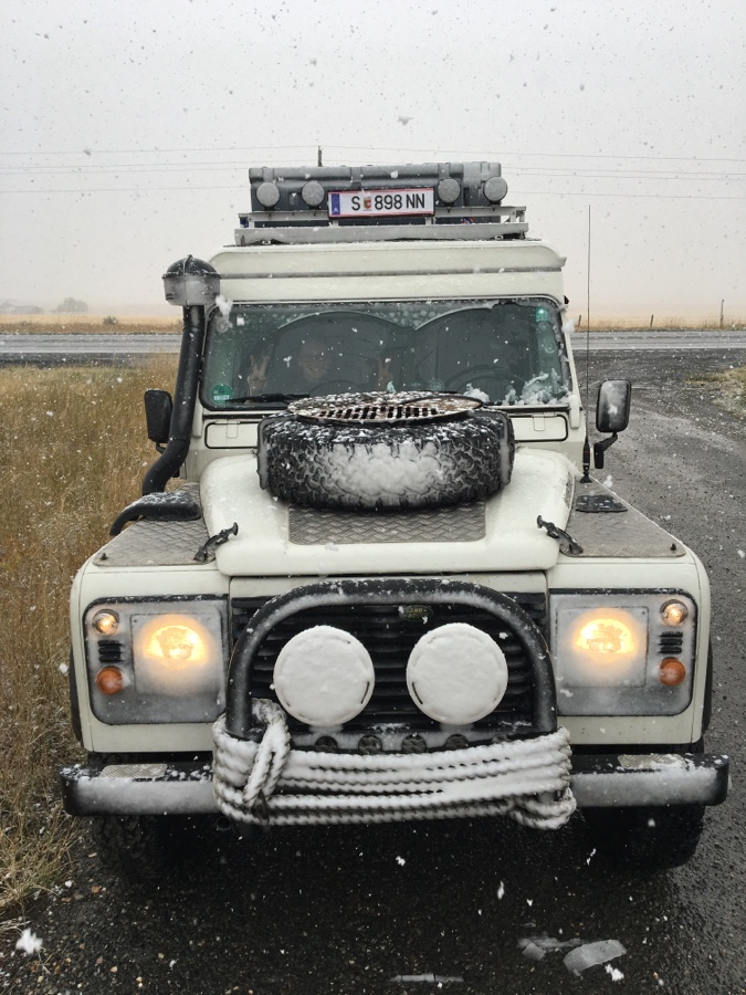 Aber der Schnee auf gelben Birkenblättern sowie alten Autos hat auch irgendwie seinen Reiz und außerdem kommen wir so schneller nach Süden. Martin redet seit Jasper vom warmen Süden… aber erstmal wirds richtig kalt und der Defender samt Antenne bekommt eine Eisschicht.