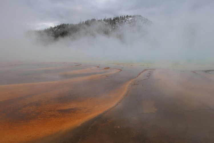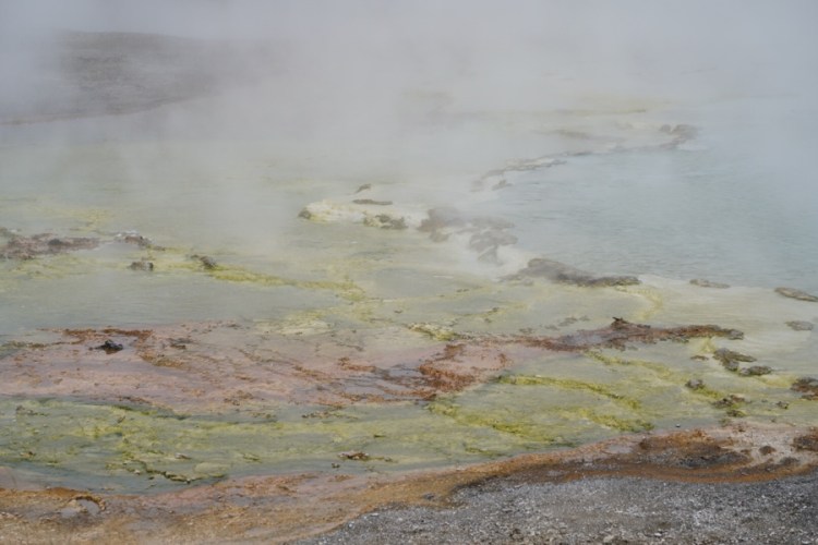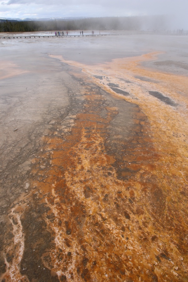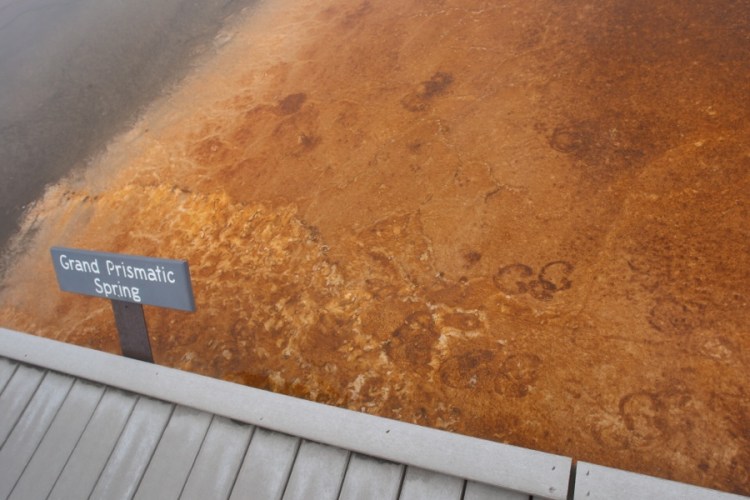Der Grand Prismatic Spring ist der größte Hot Spring der Welt. Die Farben am Rand entstehen durch Kolonien von hitzeresistenten – oder eigentlich besser gesagt thermophilen – Mikroorganismen, welche unterschiedliche Temperaturen bevorzugen.
