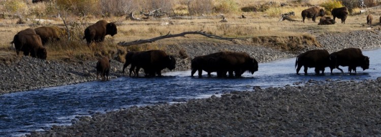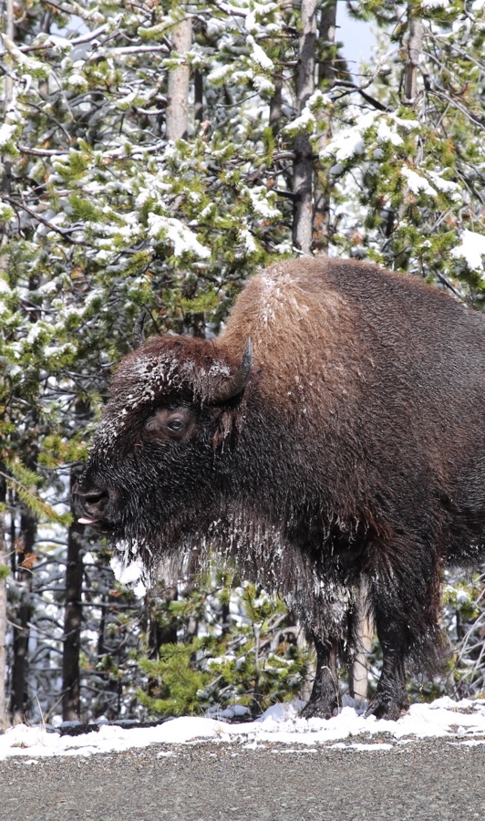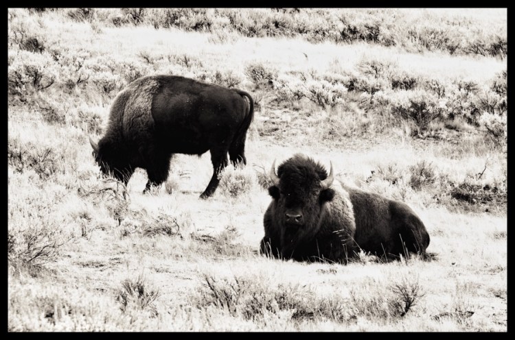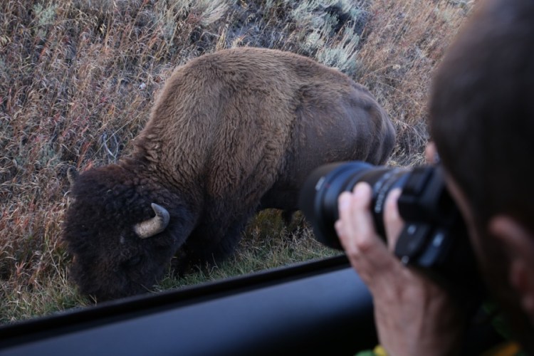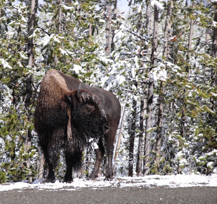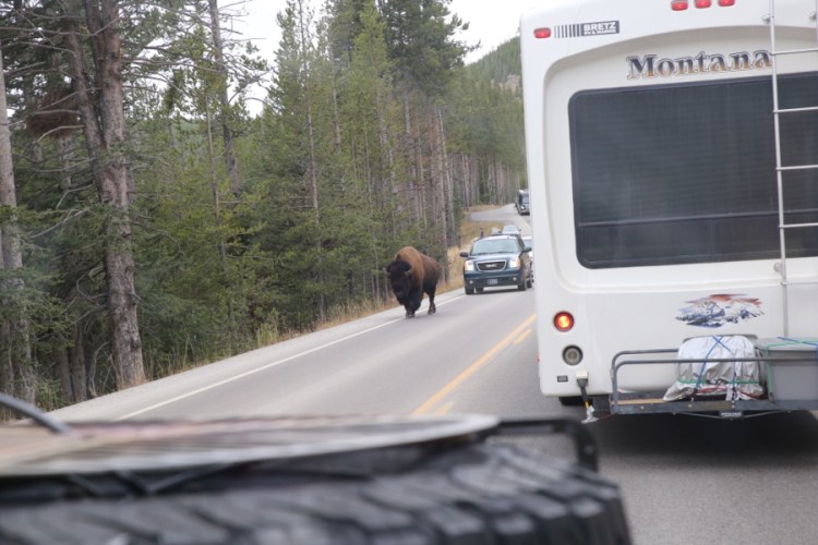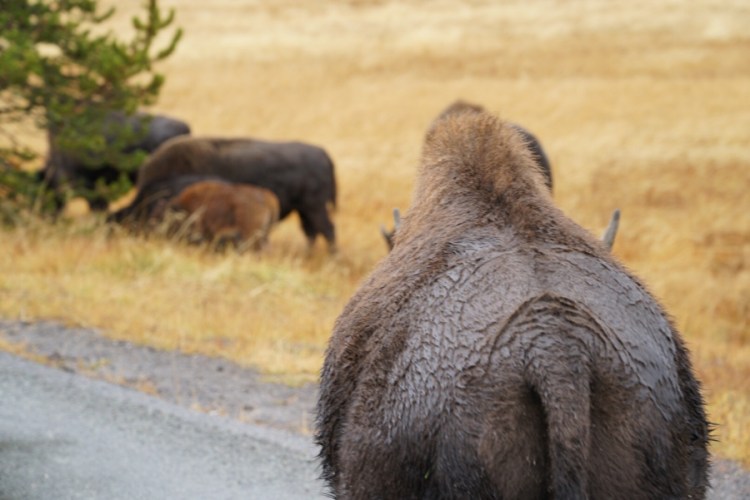 Bisons gibt es im Yellowstone fast überall, da hält man es kaum für möglich, dass sie vor mehr als hundert Jahren fast ausgerottet waren. Dank der Initiative den Yellowstone National-Park 1872 zu gründen konnte man ihren Bestand retten. Vor Ankunft der Siedler betrug die Anzahl der Tiere fast 30 Millionen, danach wurden sie bis auf 30 Tiere dezimiert, heute ist der Bestand wieder auf gut 30.000 gestiegen. Wenn man diese Zahlen vergleicht, kommt man sich als Mensch schon komisch grausam vor. Da sieht man es als Geschenk an, diese starken und urigen Tiere in freier Wildbahn aus der Nähe beobachten zu dürfen. Und „Nähe“ ist oft wörtlich gemeint, die spazieren in einer Seelenruhe an der Straße entlang, sodass sie fast zum Greifen nah sind!