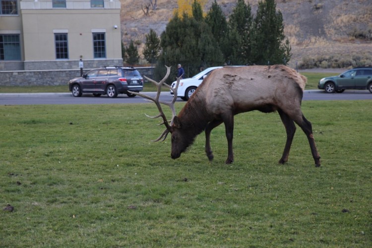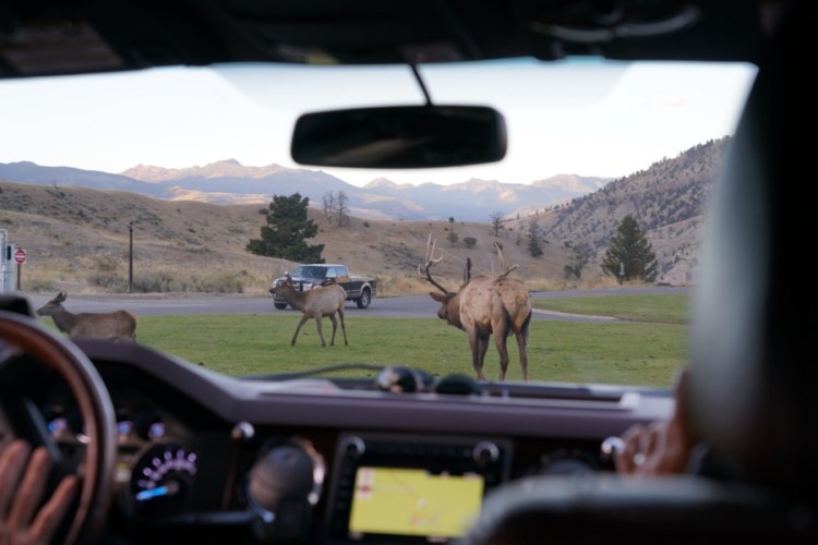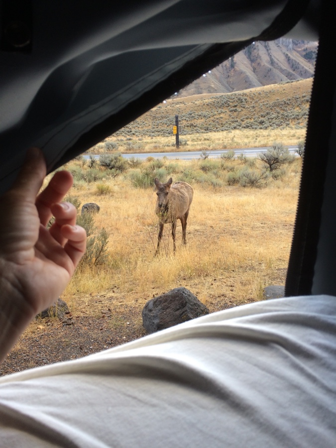 Bevor wir selbst im Yellowstone frühstücken, können wir vom Hochdach aus schon den Hirschen beim Frühstücken zusehen. Nach zwei von vier Nächten war der Blick aus dem Seitenfenster am Morgen so ein Erlebnis!