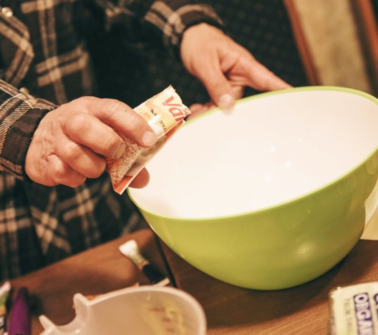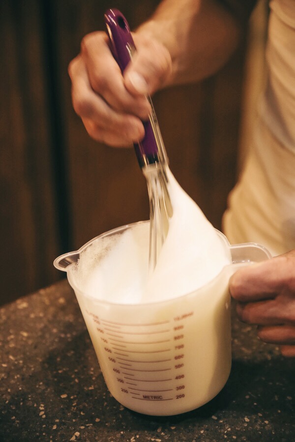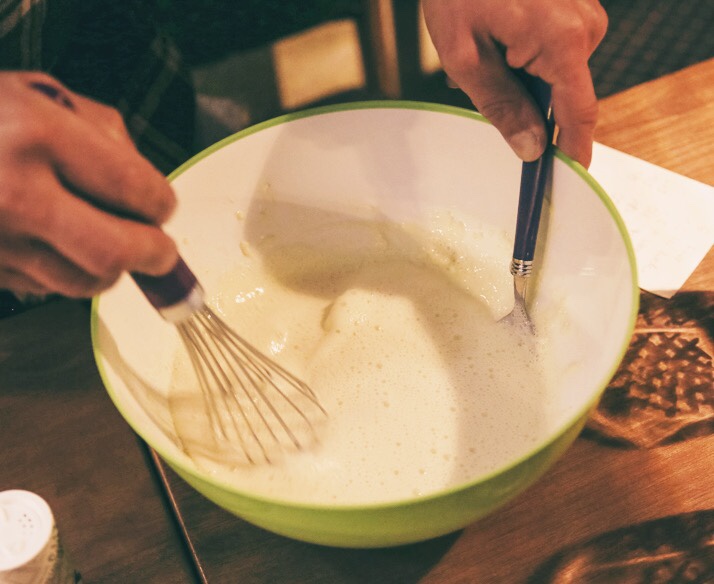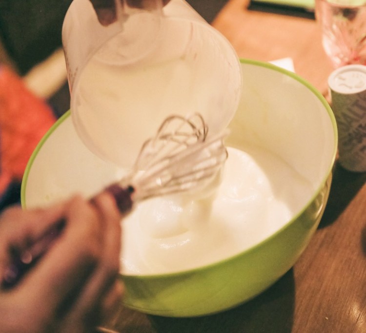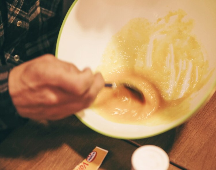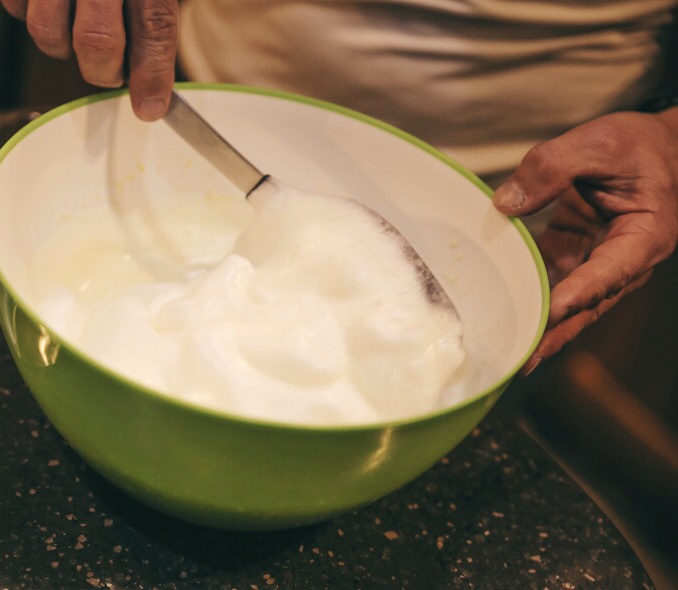 Mix eggs yolk, sugar, vanilla sugar and salt until it foams.