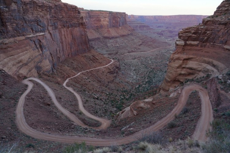 Entlang den Spuren des White Rim Trails fahren wir eine kleine freie offroad Runde von Moab bis in den Canyonlands Nationalpark. Das letzte Stück geht eine steile Felswand hinauf, an der man keine Straße sieht – einfach geil! Perfekt zum Sonnenuntergang kommen wir oben an und genießen den Ausblick auf unsere Route zurück.