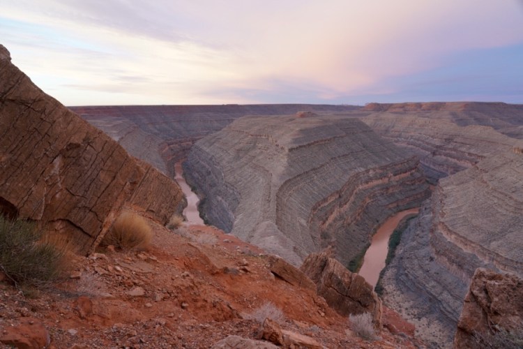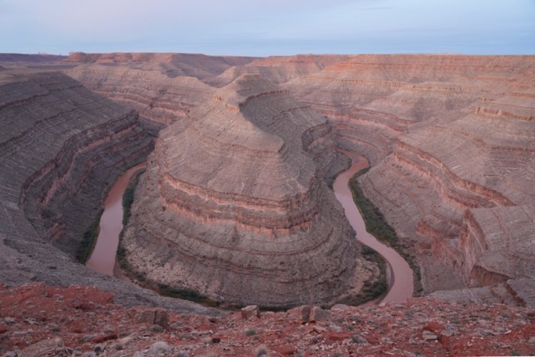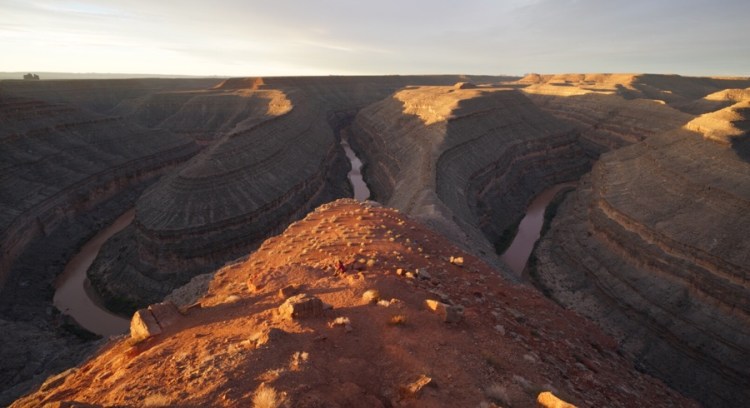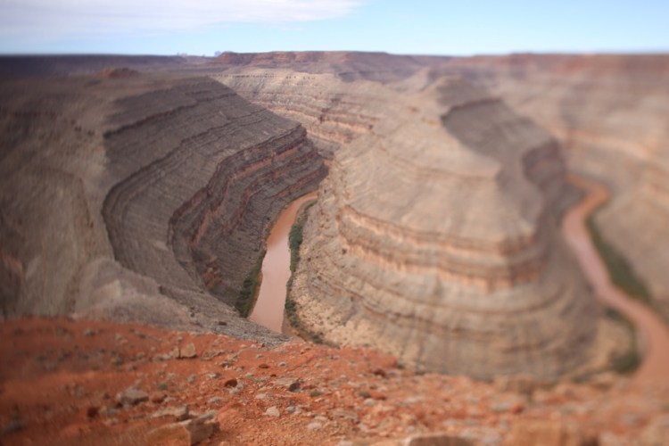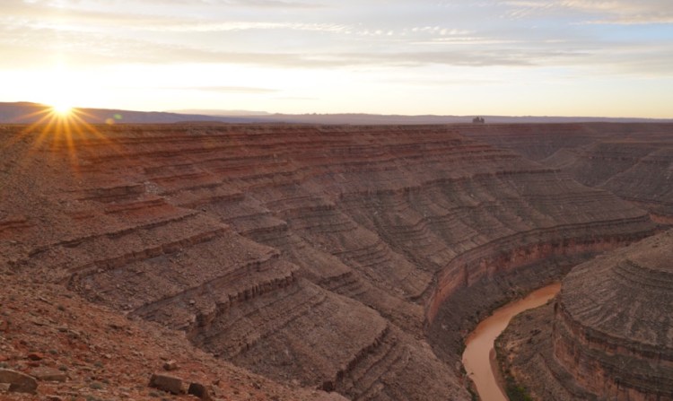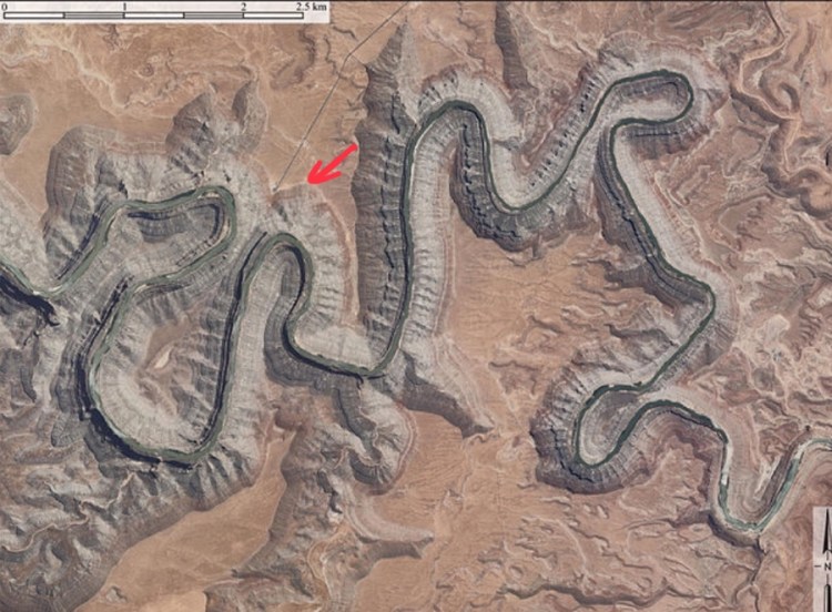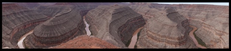 Wiki sagt: „Der Goosenecks State Park ist ein State Park im Südosten des US-Bundesstaates Utah, nicht weit entfernt von Mexican Hat und dem Monument Valley. Vom Aussichtspunkt (welcher sich in ca. 1500 m Höhe befindet) kann man einen Blick auf den San Juan River werfen, der sich im Verlauf von Millionen Jahren inzwischen gut 300 m tief gegraben hat. Der Fluss windet sich auf einer Länge von 8 km vor und zurück und legt dabei gerade einmal eine Luftlinie von 1,6 km zurück.“ (Luftbild: Wikipedia)