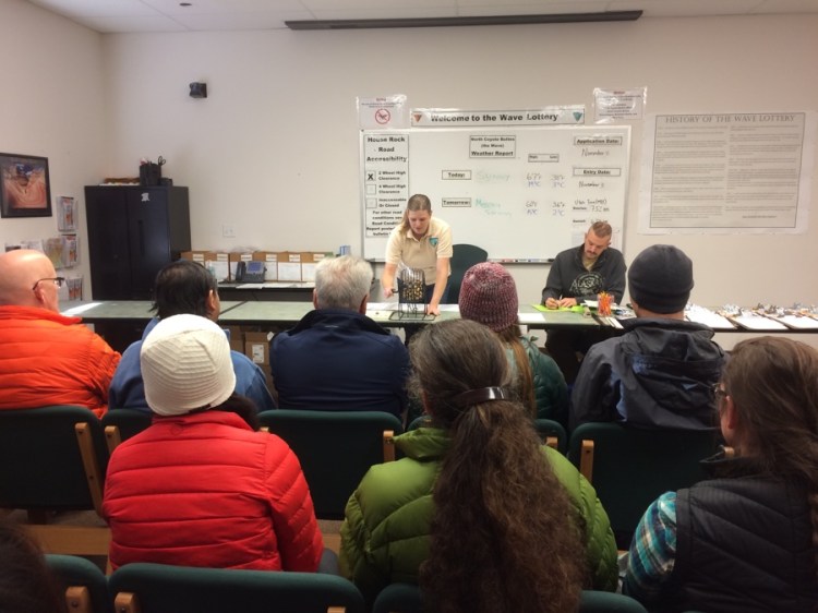 Soweit so gut, ich möchte es probieren, wenn wir schon in der Nähe sind – zumindest einmal! Neben uns an der Tanke hat ein Pärchen aus Italien im Bus geschlafen. Sie probieren es den dritten Tag hintereinander. Es sind 46 Teamleader (pro Team sind 1-6 Personen möglich) im Raum, jeder bekommt eine Nummer. Ich habe Nummer 33 erwischt. Martin musste aus dem Raum gehen, schade, denn es war echt spannend. Um Punkt 9 Uhr ist Anmeldeschluß – Rien ne va plus! Dann erklärt die freundliche Dame, man solle nicht traurig sein, wenn man nicht gewinnt, ringsum gibt es 100erte schöne Locations, nicht nur die Welle. Sie hat 46 Kügelchen in einem kleinem Käfig, nacheinander dürfen ein par raus, wie im Lotto: erstmal wird ein zweier Team gezogen, dann ein Viererteam, darauf unverhofft das italienische Pärchen, dann eine Einzelperson. Nur noch ein Platz ist übrig! Hm,… verloren! Aber sie erklärt: es wird jetzt nochmal gezogen und zwei Personen dürfen gehen, da sie Zweierteams nicht trennen wollen und ohnehin eigentlich keiner allein wandern gehen sollte. Ein eventuell gezogenes 4er Team müsse aber zwei Leute im Hotel lassen – Ok, also noch eine Chance für uns… ich halte die Luft an! – vierunddreißig! Knapp daneben!