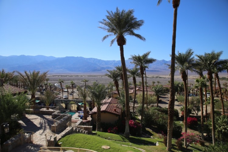 Auf dem Weg ins Tal lockt die Oase Furnace Creek mit dem Viersternehotel Furnace Creek Inn aus den 20er Jahren. Hier zwei Nächte bleiben, im Pool schwimmen, im Palmengarten spazieren, die Aussicht und das schöne Hotel genießen – wär ein Traum! In diesem Hotel muss man eigentlich ein Buch schreiben, man ist außerhalb jeglicher Welt, wirklich eine Oase! Aber: teuer, weshalb es nur beim Glas Rosé bleibt.