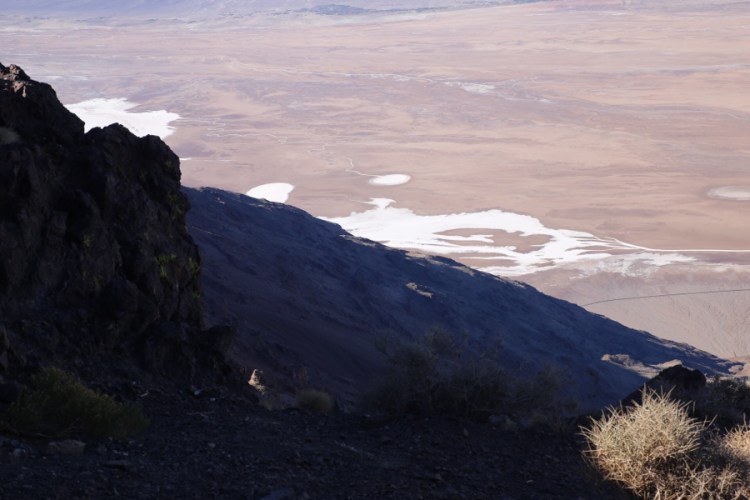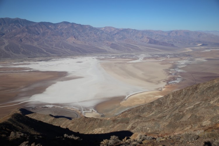 Dann gehts über die Berge ins Death Valley, das sich erstaunlich bunt zeigt. Erstmal gehts rauf zum Dante‘s View. Der Name dieses Aussichtspunktes auf 1650m bezieht sich auf Dantes Inferno und bietet einen Blick übers ganze Tal. Wow! Da unten spazieren Menschen in die Salzwüste hinein, wie winzige Ameisen.