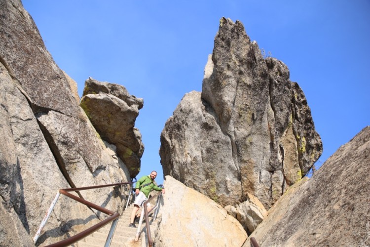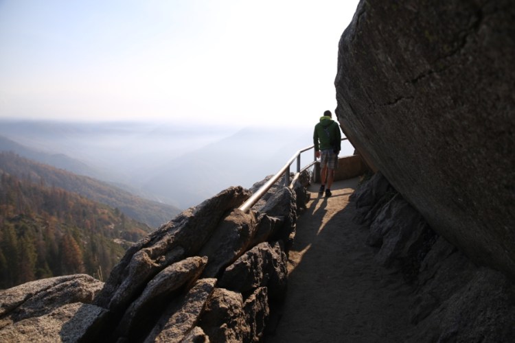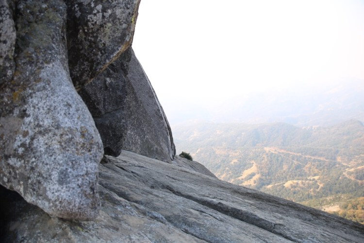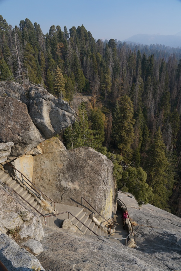 Der Moro Rock ist unser Einstieg in den Sequoia National Park. Ein Granitmonolith, sprich ein großes Etwas, das nur aus EINEM Stein besteht, der eine schöne Aussicht und interessante Perspektiven bietet. Die Aussicht über die runde Kuppe ist ziemlich ähnlich dem Dome Rock, aber spannender zu erklimmen. Man fragt sich, wer warum mit ziemlich viel Aufwand diese Treppe hinauf gebaut hat… zunächst aus Holz, mittlerweile aus Beton. Aber vermutlich ganz simpel: weil er da ist!