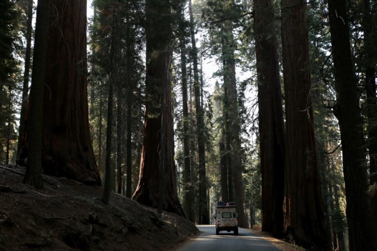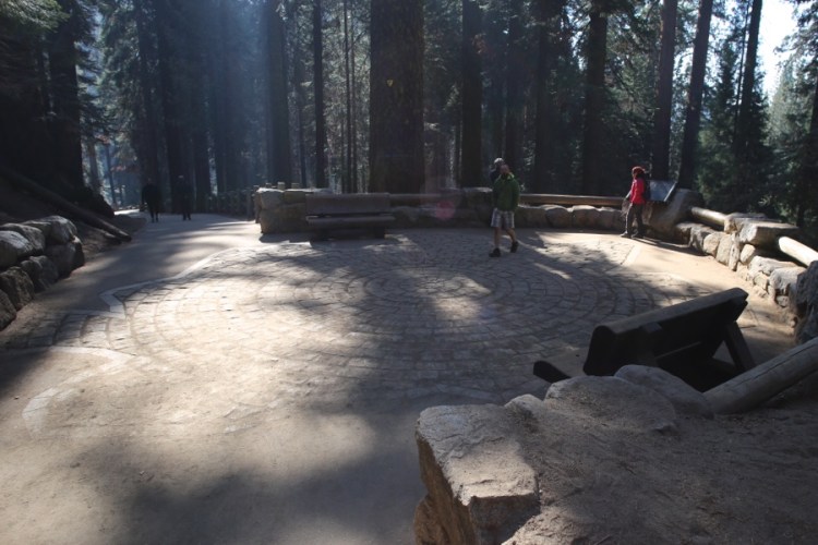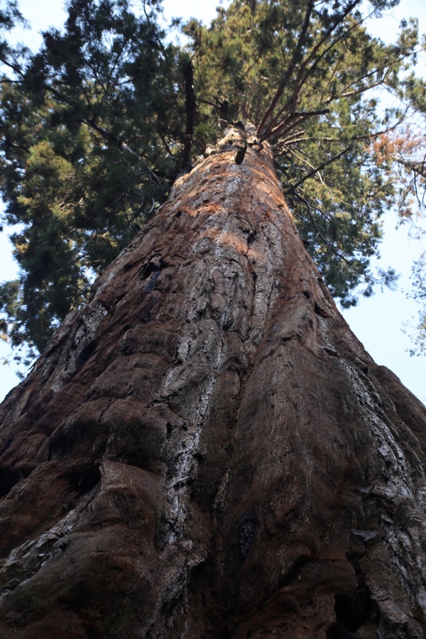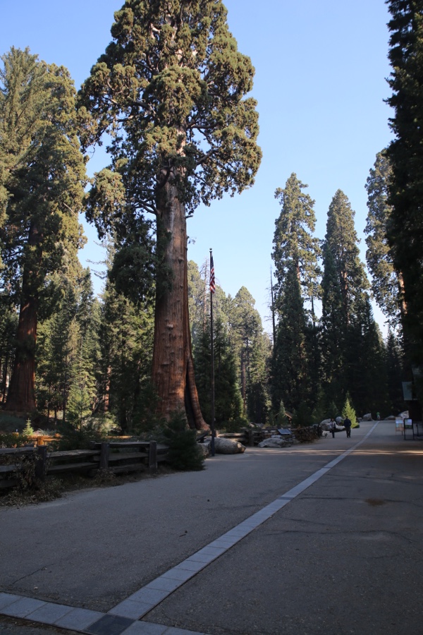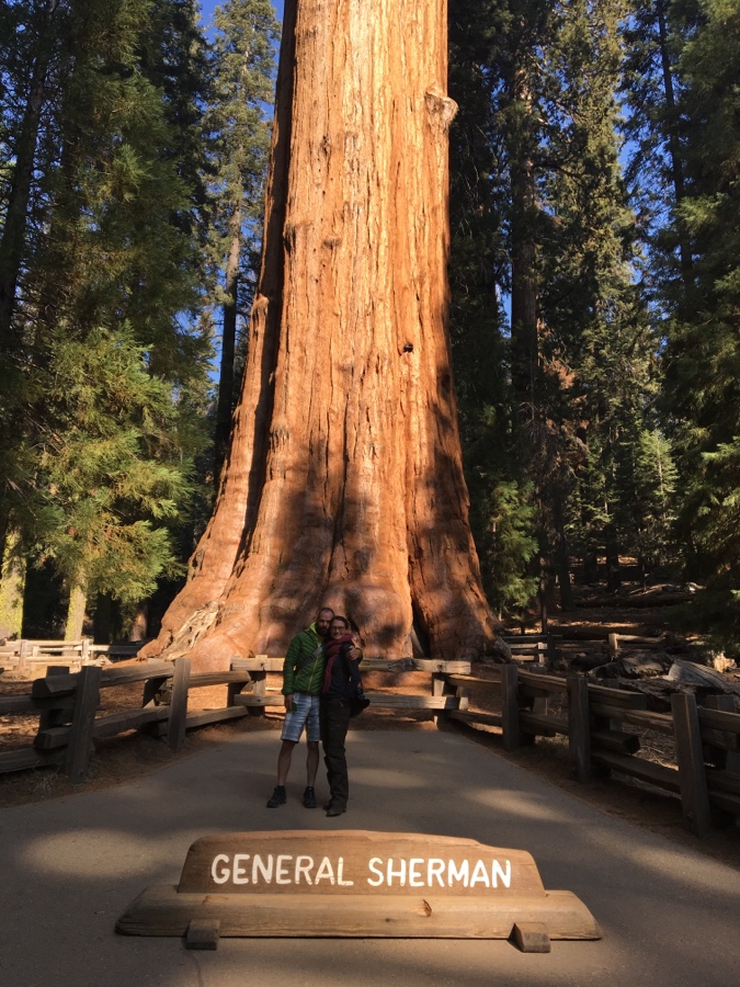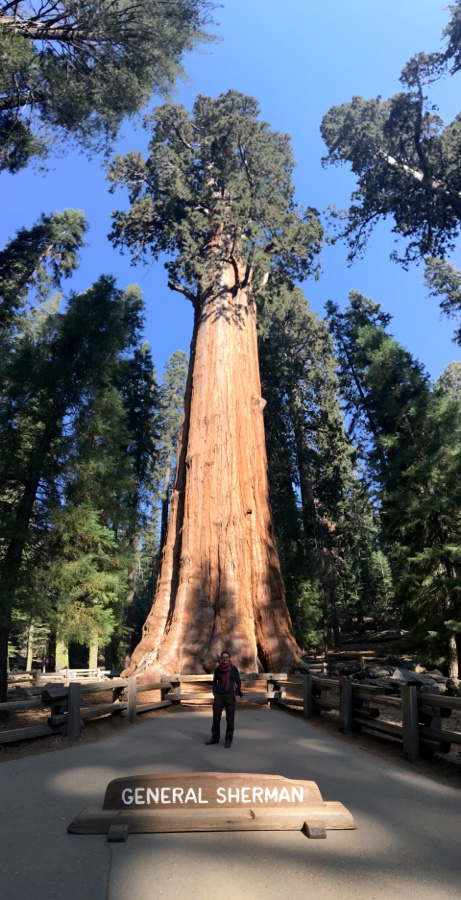Der Weltrekordhalter ist der General Sherman Tree mit über 31 Meter Umfang an der Basis und einer Höhe von 81 Meter. Hört sich viel an, und die Basis ist als gepflasterte Fläche auch ziemlich beeindruckend, aber es gibt höhere und dickere Bäume. Den Rekord unter den lebenden Riesen hält er weltweit mit über 1480 Kubikmeter Gesamtvolumen. Oftmals skippen wir solche Sehenswürdigkeiten-hot-spots, aber den Sherman Tree besuchen wir… ist ja sowieso nur ein Wimpernschlag in seinem auf zwischen 1500 und 1900 Jahre geschätzten Leben!