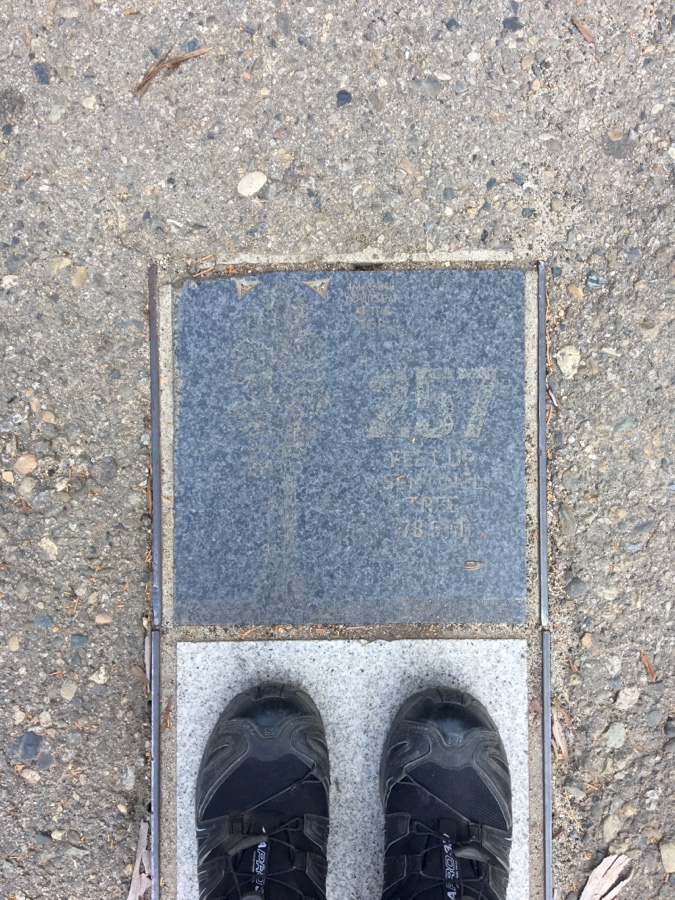 Ein „durchschnittlicher“ Sequoia steht vor dem Visitorcenter. Auf der Skala am Boden realisiert man erst die Größe des Baumes. Martin steht sozusagen am Wipfel… ich am Boden.