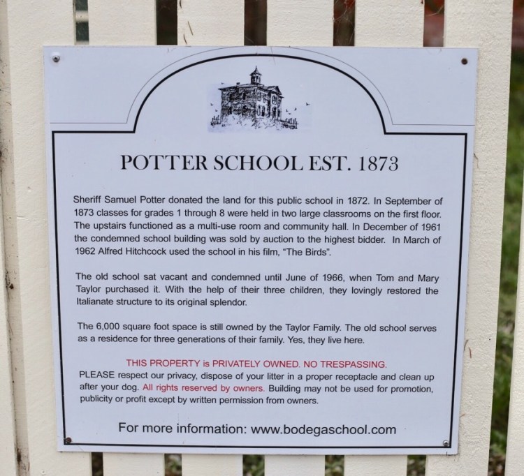 Also schaun wir wiederum „Die Vögel“ in Ferndale im Auto an, sozusagen als Vorbereitung für San Francisco und… für Bodega Bay. Hier wurde ein Großteil des Filmes gedreht. Nicht im Hafenort, sondern ein paar Kilometer entfernt davon, steht das Schulgebäude. Mittlerweile in Privatbesitz darf man es nur von außen betrachten und wir fragen uns, wie es ist, in so einem Gebäude zu wohnen, das bestimmt oft von Touristen gesucht wird.