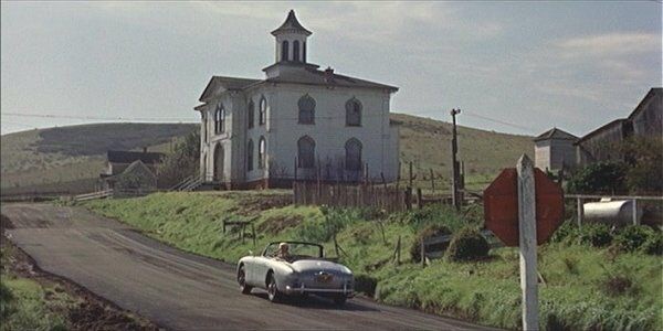 Die Kirche daneben steht auch noch, das Haus der Lehrerin dahinter gibt es aber nicht mehr. Zufällig mache ich ein Foto mit dem gleichen Bildausschnitt wie ein Making-Of Bild mit Hitchcock. Nur der Defender müsste noch an die Stelle des Lastwagens…