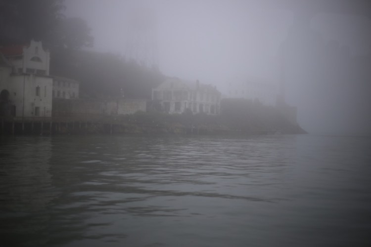 Perfekter hätte man die Anfahrt mit dem Boot nicht inszenieren können, aus undurchdringlichem Nebel taucht die Insel auf. Unheimlich und sehr passend.