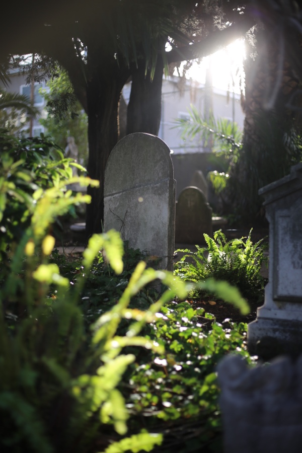 Man könnte zwei Tage damit verbringen, alle Schauplätze abzuklappern, aber einen wollte ich mir anschaun: die Mission Dolores. Einen Hang zum Unheimlichen und ein Faible für schöne alte Friedhöfe hab ich ja sowieso, das Licht passte auch perfekt und die Mission ist quasi mitten in der Stadt.