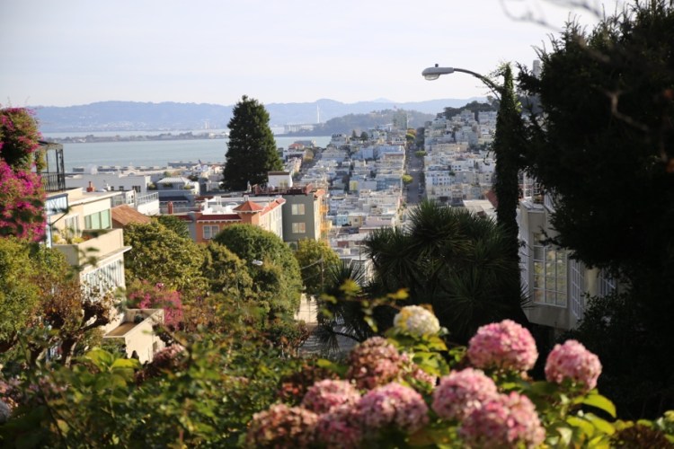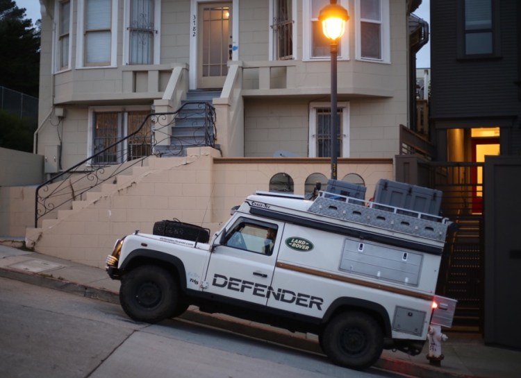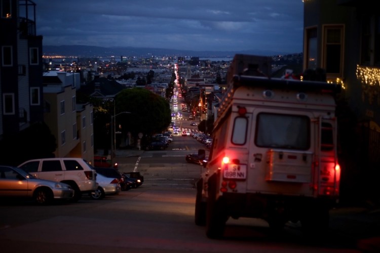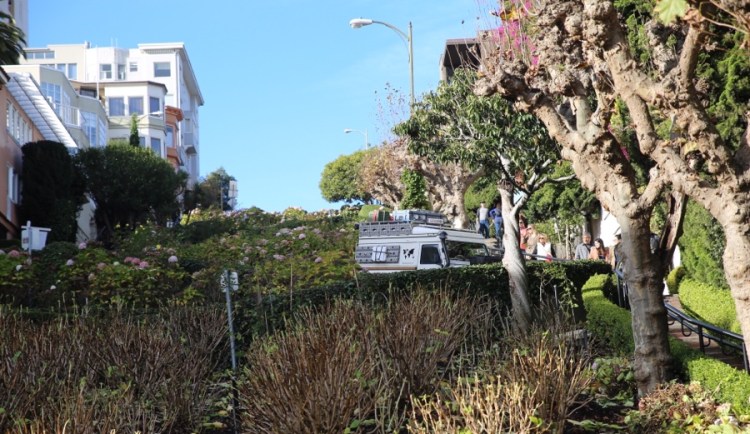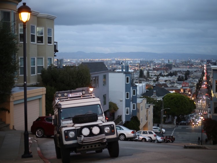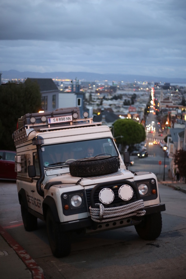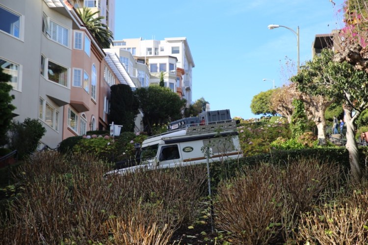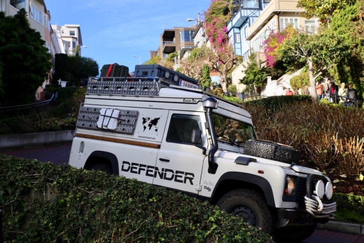 Natürlich darf der Defender die Lombardstreet runterkurven. Die steilste Straße San Franciscos (27 Prozent Gefälle) wurde in den 1920er Jahren mit 8 Kurven entschärft.