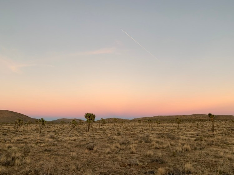 Zurück in der Camperrealität stehen wir abends dann vor dem Joshua Tree Nationalpark auf einem staubigen, teils dreckigen – aber kostenlosen Platz mit einigen anderen Autos in Sichtweite. Ein inoffizieller Campingspot, wir stellen uns einfach neben den Weg, es ist dunkel, suchen nicht lang rum.
