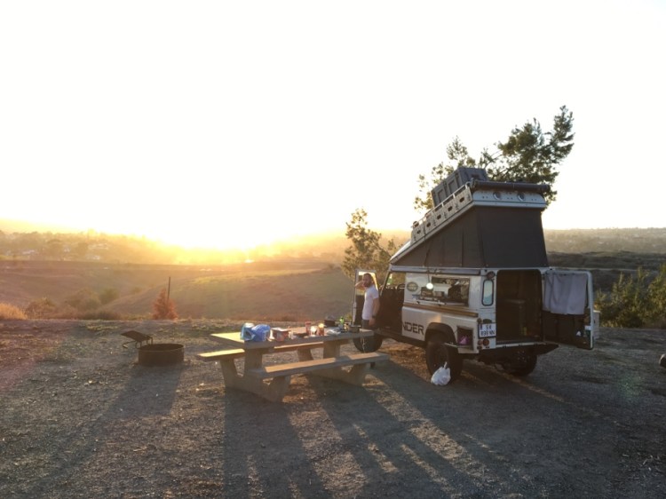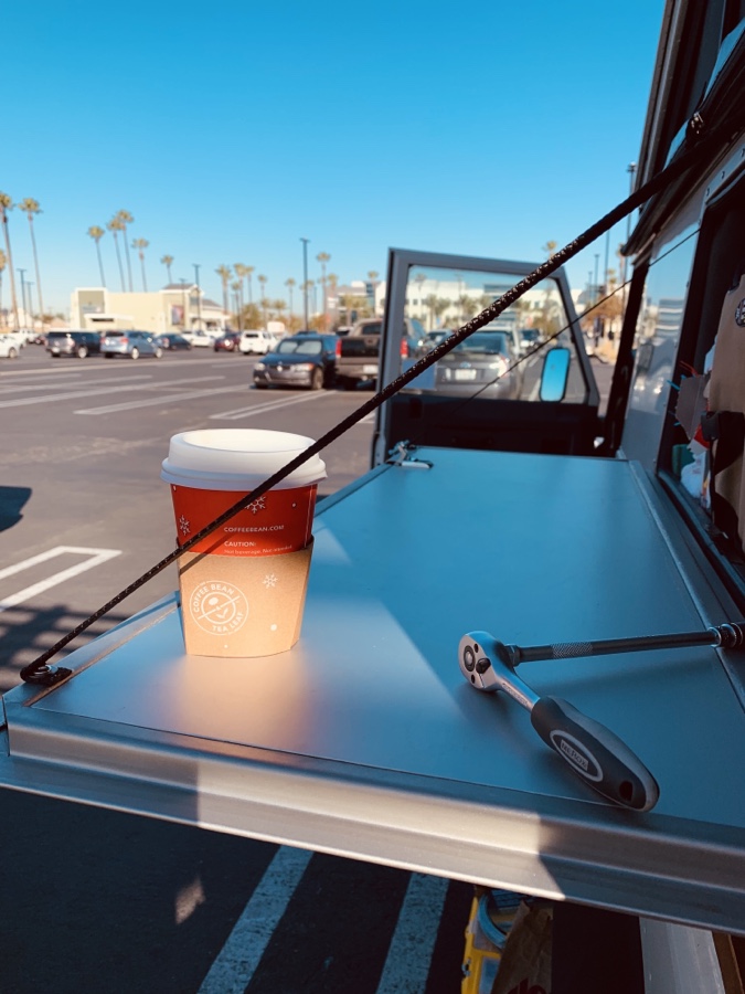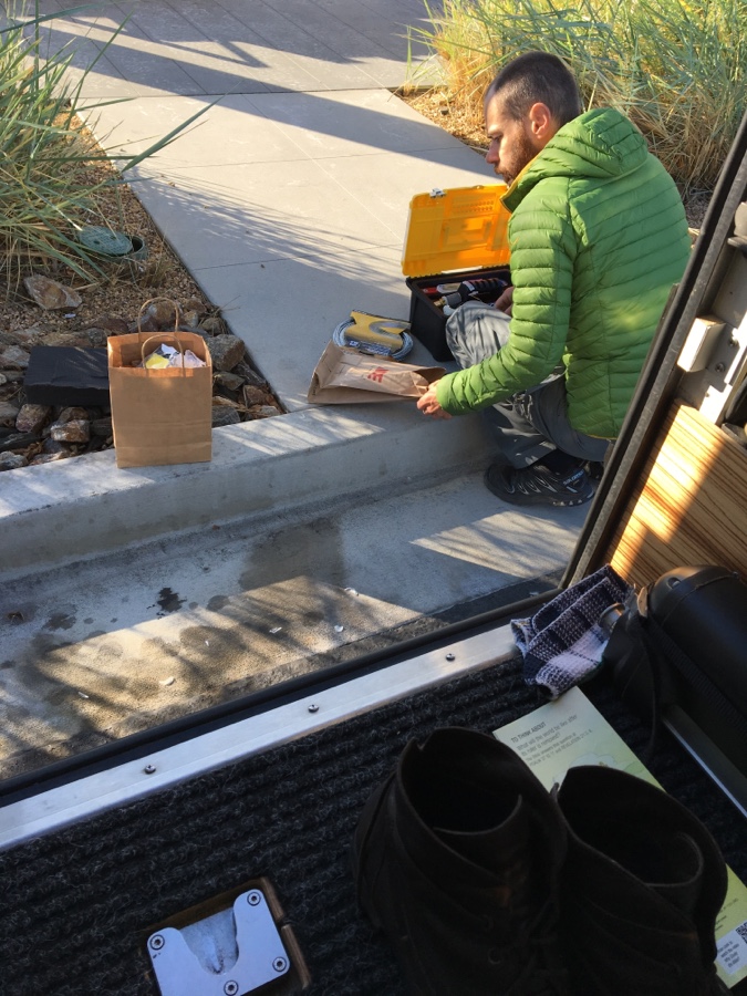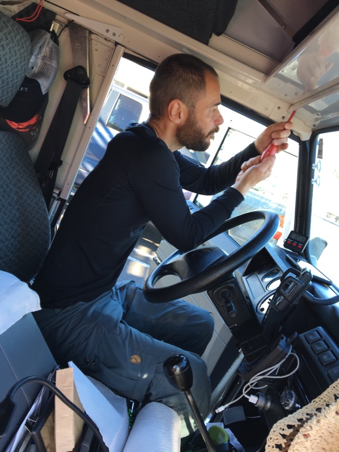 Aufstehen auf einem Supermarktparkplatz, die erste Sonne genießen, in den Supermarkt latschen, Verkäuferinnen einen guten Morgen wünschen, an ihnen vorbei die Toilette ansteuern, dort Zähne putzen. Zum Auto zurück gehen – je nach Klientel des Supermarktes oft an merkwürdigen Gestalten vorbei – und ein Müsli auf der Motorhaube essen. Lassen Dach runter, Martin holt Werkzeug vom Dach, Martin zieht Schrauben fest und wir verstauen das Werkzeug erstmal im Auto.