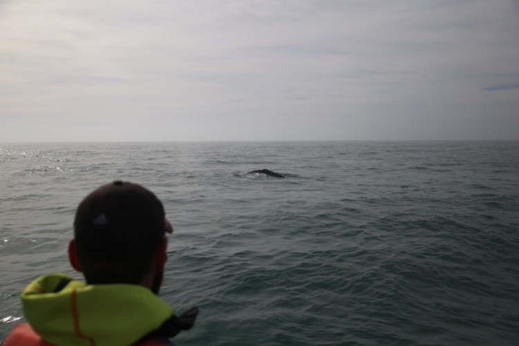 Dann seh ich da rechts vor uns grad noch einen Rücken im Meer verschwinden… wir warten und schauen angestrengt. Und schauen und warten…