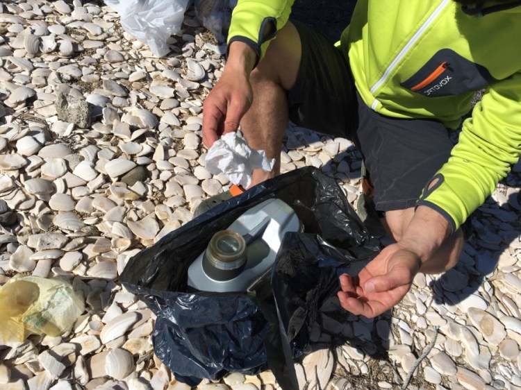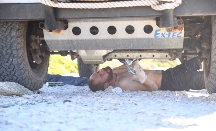 Schwitzend schaufle ich Zentimeter für Zentimeter von den Muscheln weg, damit ich zum Reifen komme, um die Bleche unterzulegen. Eine gefühlte Ewigkeit später, ziemlich k.o., denn ich schaufle fast alles frei, legen wir die Bleche ganz knapp an die Hinterreifen. Vorne geben wir Steine hin um nicht wieder zu versinken.