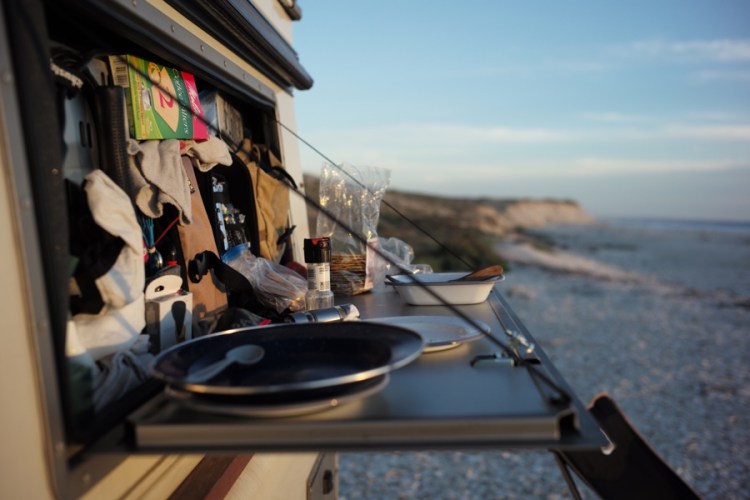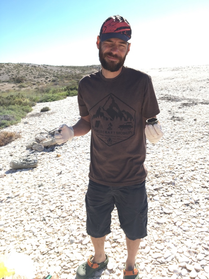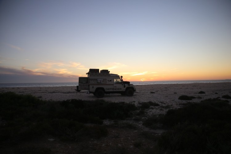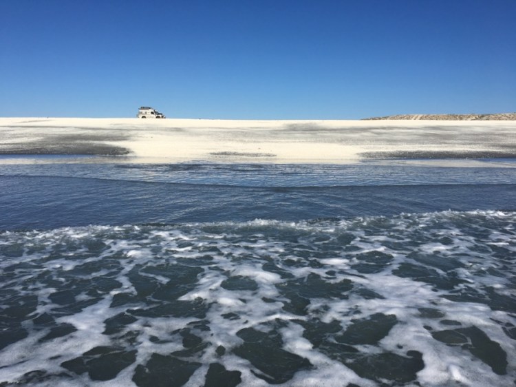 Wir suchen uns einen kleinen Abstecher zum Meer und finden einen Weg direkt runter zum Strand. Zuerst Sand, dann nur mehr Muscheln… wow, wir fahren auf Muscheln. Man sinkt ein bisschen ein, jedoch nicht so schlimm, mit ein bisschen Gas geht es recht gut.