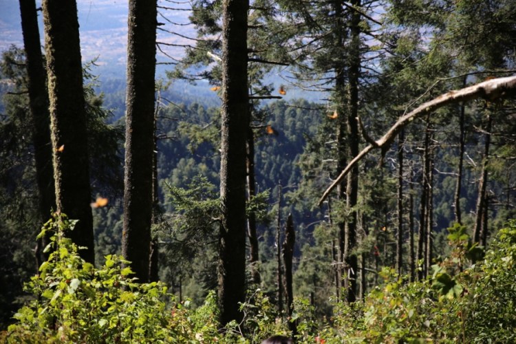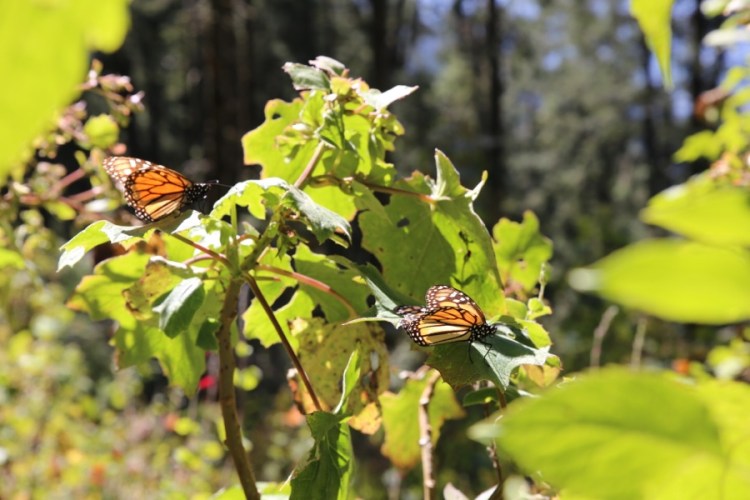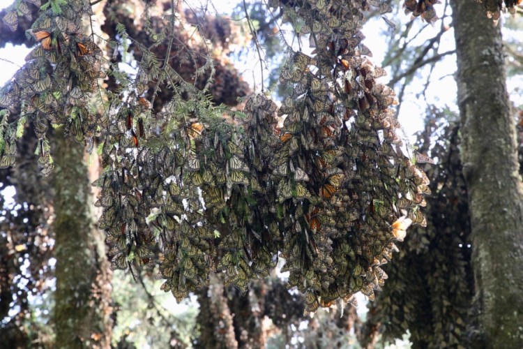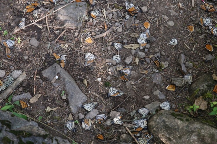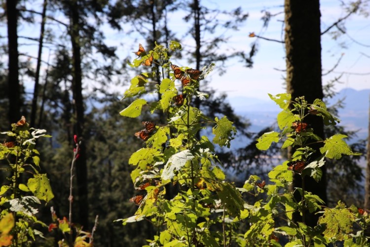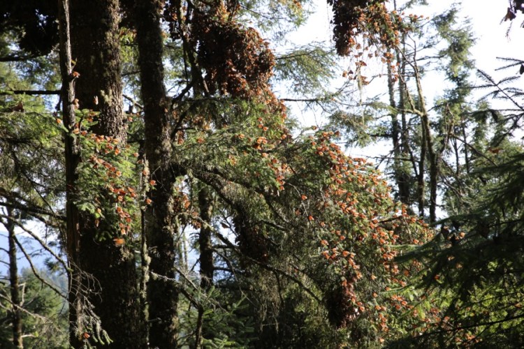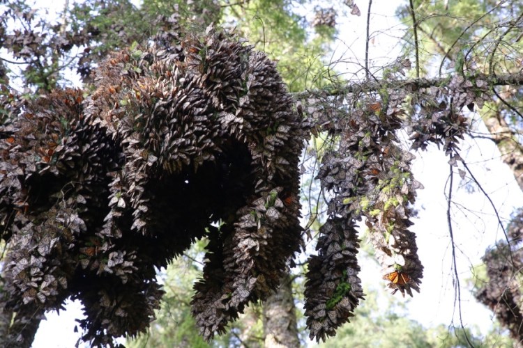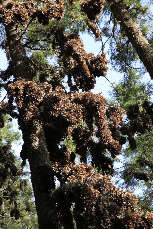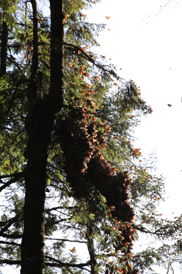 Westlich von Mexiko City auf über 3000 Höhenmeter überwintern jährlich etwa 100 Millionen Falter ab November im Kiefernwald. Erst 1970 wurde dieser abgelegene Winterplatz von einem Zoologen entdeckt. In mehreren Generationen fliegen sie im März zurück in das Sommerquartier, wobei die Falter, die sich in Mexiko gepaart haben auf dem Weg Eier ablegen und sterben. Die jungen geschlüpften Falter fliegen dann weiter. Je nach Zielort und Distanz gibt es verschiedene Stämme und zwischen zwei und fünf Generationen mit unterschiedlichen Lebenserwartungen… kompliziertes System, müsst ihr selbst mal nachlesen!