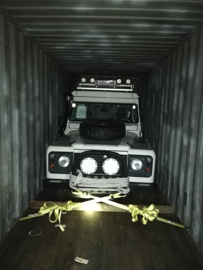 17. Am nächsten Morgen erfahren wir, dass der Zoll bis 19:00 Uhr das Auto kontrolliert hat, danach kam es in den Container. Puh, wir haben richtig gemessen – die Höhe hat gepasst!