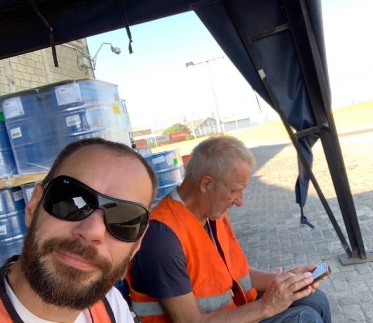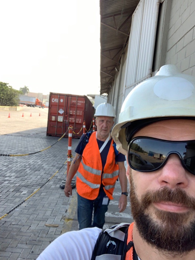 Jetzt warten wir beim Bus um im Hafengebiet zum Container gebracht zu werden.