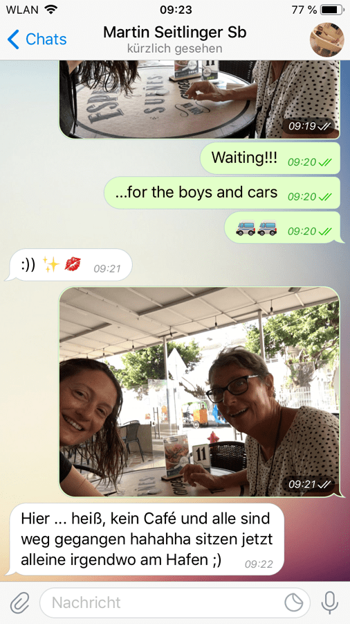 Martin wartet darauf wieder zum Hafen zu kommen, ich auf das Ende der Mittagspause des Versicherungsbüros.