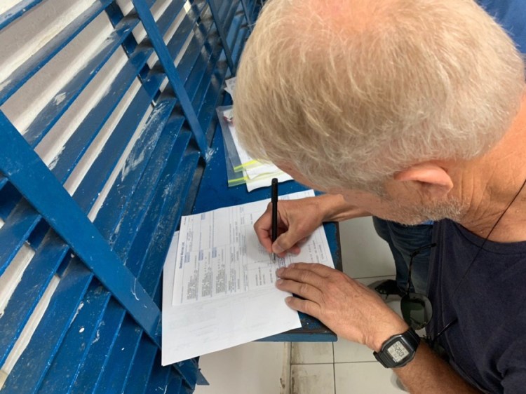 Donnerstag 9:40 Cartagena: Aktuell warten wir auf die Bestätigung unserer Zahlung, die sie anscheinend noch nicht haben. Unser Agent ist mal eine e-Zigarette rauchen gegangen und wir sitzen in dem viel zu kleinen Office mit 7 anderen Hafenpersonen. Alle 2 Minuten leutet mit kolumbianischer Musik irgendein Handy und einer hat ständig Musik laut laufen, das Handy zwischen Helm und Ohr eingeklemmt. Alle kommen mit dem Roller oder Motorrad hierher.