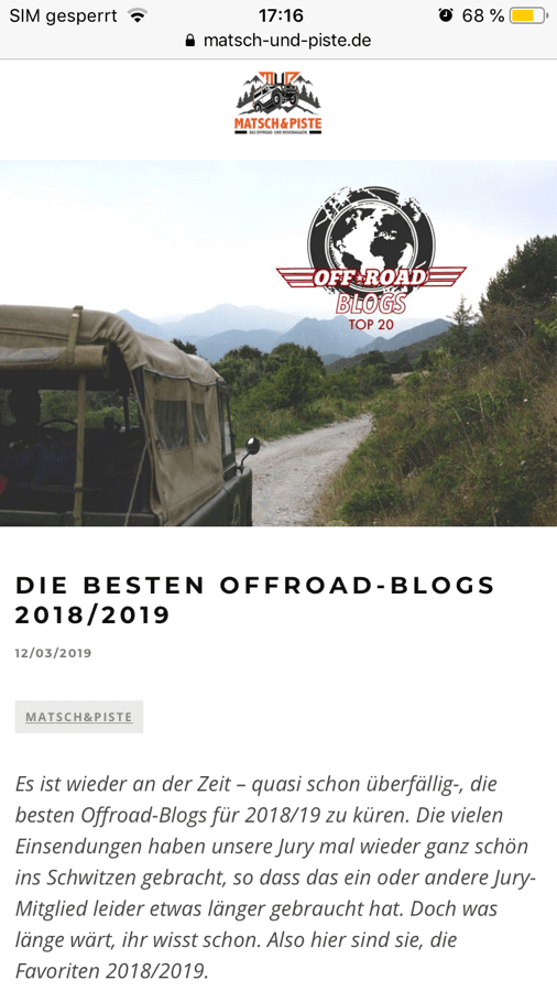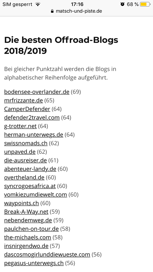 Unser defender2travel.com wurde von Matsch&Piste, einer unter Offroadern sehr bekannten und beliebten Internetplattform, in die besten Blogs 2018/19 gewählt!
