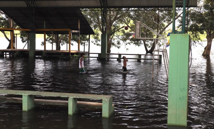 Auch die Sportplätze stehen unter Wasser, aber ein echter Indigener lässt sich davon nicht abschrecken.