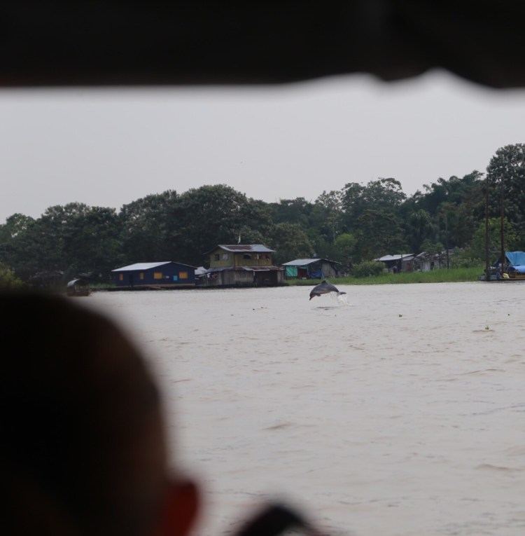 So, genug geschaut, jetz geht’s auf zur ersten Amazonas-Tour… bin nervös, der Wanderrucksack darf ausnahmsweise mal raus und wir sind mit Mückenschutzmittel und Sonnencreme bewaffnet. Die Wanderschuhe haben zwar auch Ausgang, aber bei so viel Wasser ist eine Wanderung quasi fast unmöglich. Vom Boot aus sind jedoch die Delphine gut zu beobachten.