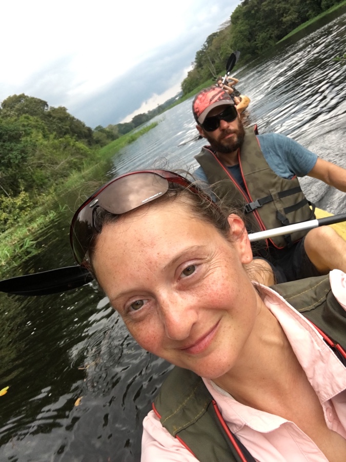 Ja, es gibt eine Tour! Aber „mas joven“, also für jüngere Leute, mit Kajakfahren. Ok, wir lassen uns überraschen und unversehens paddeln wir nach dem leckeren Mittagessen brav unserem Guide hinterher. Es is voll schön so nah am Wasser zu sein und sich ohne Motorgeräusche fortzubewegen. Aber natürlich spürt man es in den Armen und ich vermute einen fetten Muskelkater heraufziehen. Währendessen zieht aber außerdem ein Gewitter herauf – Regenzeit hald! – und der Guide gibt Gas! Durch den schönen Wald wär i gern langsamer gepaddelt. Und dann wurde es echt nass und anstrengend um auf dem See gegen Regen, Wind und Wellen anzukommen um vor den Blitzen wieder an Land zu kommen. „Wer hat diese mas joven Tour eigentlich gebucht??“
